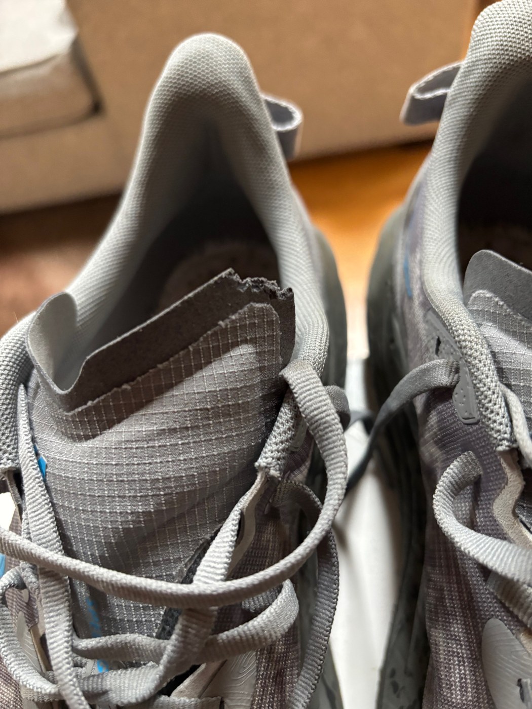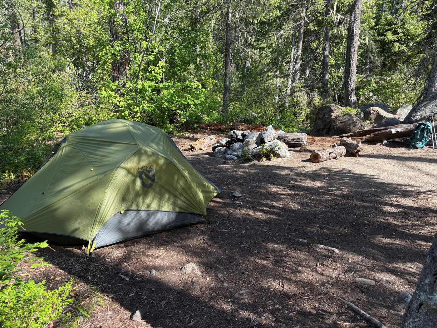 The campsite we stayed at was spacious, had a fire pit and easy access to the creek with many good sitting spots, but was very close to the trail. I was also disappointed to find that someone had done a #2 on the path between the creek and the campsite and left it there with their TP just covering it with a branch. The smell was bad enough that I moved it onto some bark, walked it well away from the creek and buried it. Also found a tent stake still in the ground and a beer can while tossing my line for a bear hang. Waking up the next morning I couldn’t find one of my gaiters that I had shoved in my shoe and left in my vestibule, I looked everywhere for it and eventually gave up after 15 minutes of searching. When I got home, the mystery was revealed when I saw tiny chew marks on the tongue of my shoe (pic below), I am guessing either I spilled some dinner on my foot without realizing it or my sweat was just that enticing for some rodent who made off with my gaiter. Lesson learned for next time, keep shoes inside of the tent!