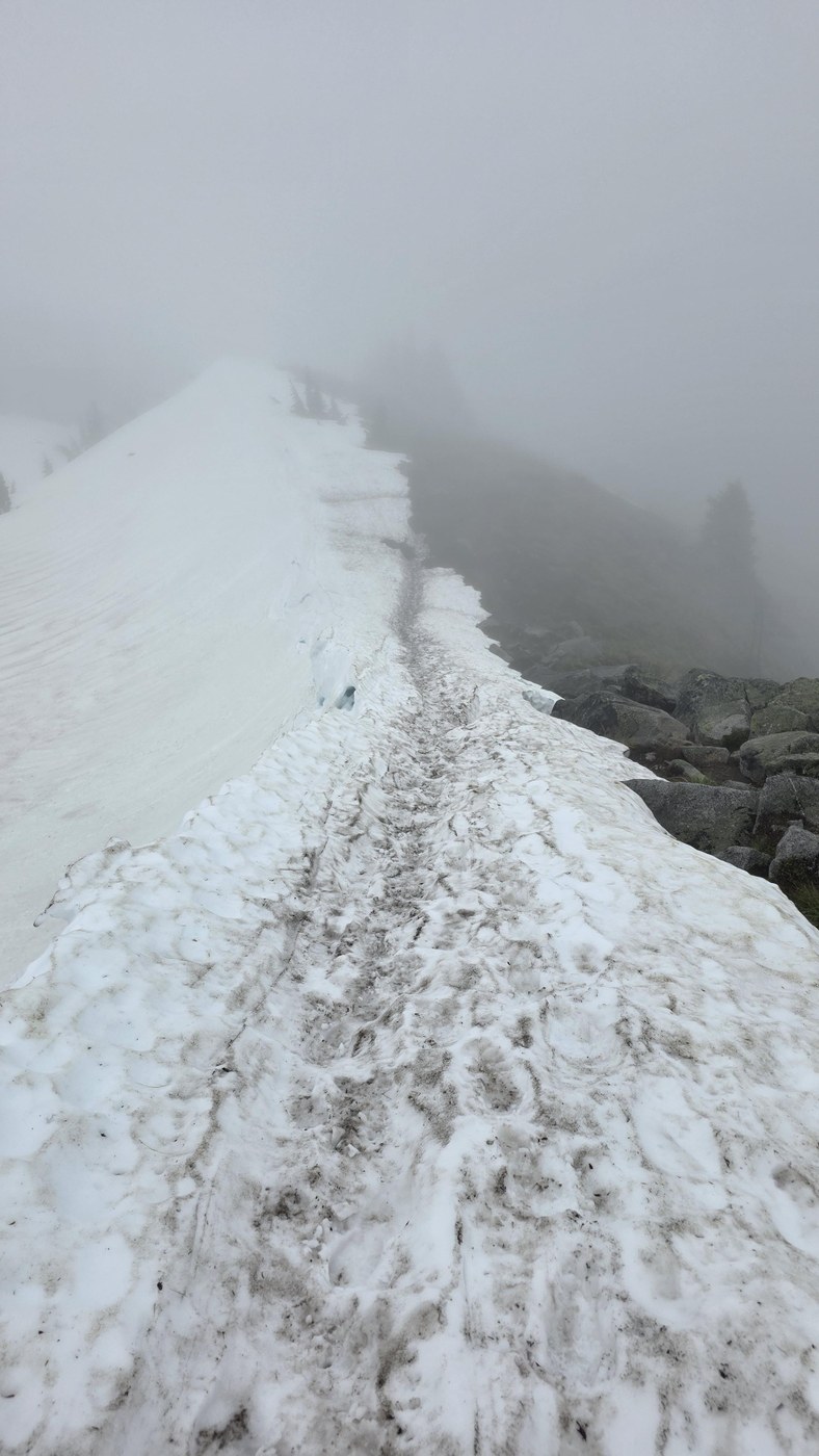 Fitness hike with a bit of weight up Granite today. The snow starts right at the little alpine lake area. The stream exiting from the lake has sketchy snow bridges so be prepared for a little leap. We put on microspikes and hiked straight up the ridge to the lookout. It was overcast/drizzly and not really cold and all this after two hot days yet we only had a little slush on top and no real postholing with the exception of some sketchy location between trees or too close to the boulder field. The boulder field is is almost completely exposed (but was wet today) and is flanked by an ever-shrinking snow 'field' of sorts. We chose to stay on that. The dropoff into the valley (no visible bootpack on the summer trail yet) is steep, the edge towards the boulder field is thinning and there are some trees that have only skinny snow bridges going through them so there are a few interesting' sections to get through, maybe 4 or 5?