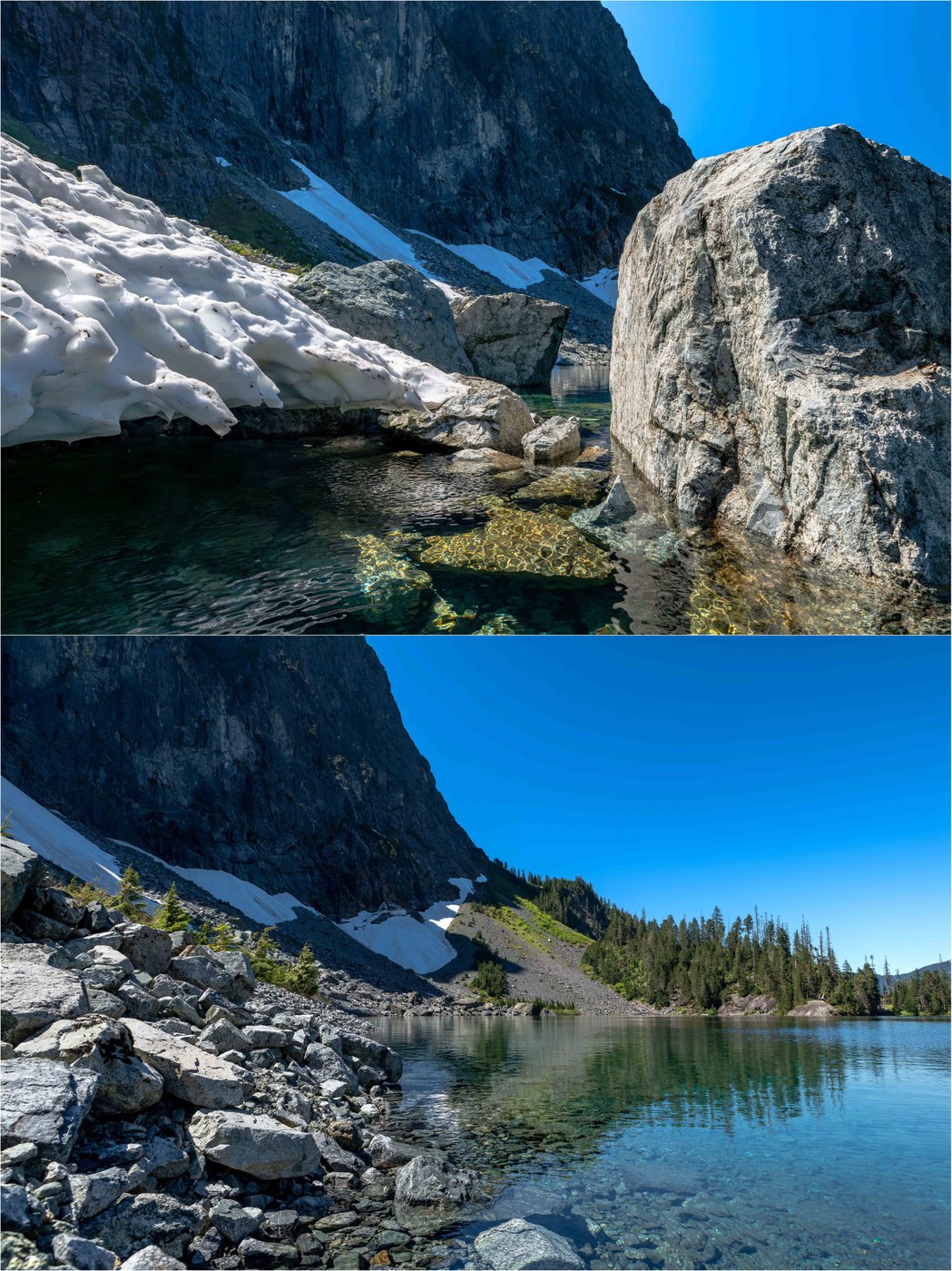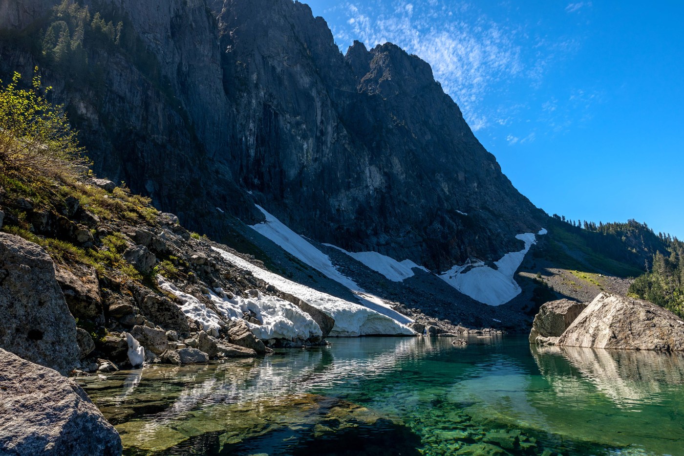 - Packraft: Lake Serene is a completely different experience on the water. IMHO, the west shore is where the best paddling is, although a good route is to circumnavigate the lake as well (suggest counterclockwise). The west shore is a maze of submerged (fully and partially) giant granite boulders - lots of fun to explore. The lingering snowfields from the Mt Index avalanche chutes are cool as well (CAUTION: The snow can collapse into the water; watch your distance). The water is amazingly clear and colorful. Paddling down to the far end of the lake provides great views of the numerous waterfalls coming off the headwall. Suggest early afternoon paddling for the best lighting conditions, as the shore will become progressively more shaded as the afternoon wanes.