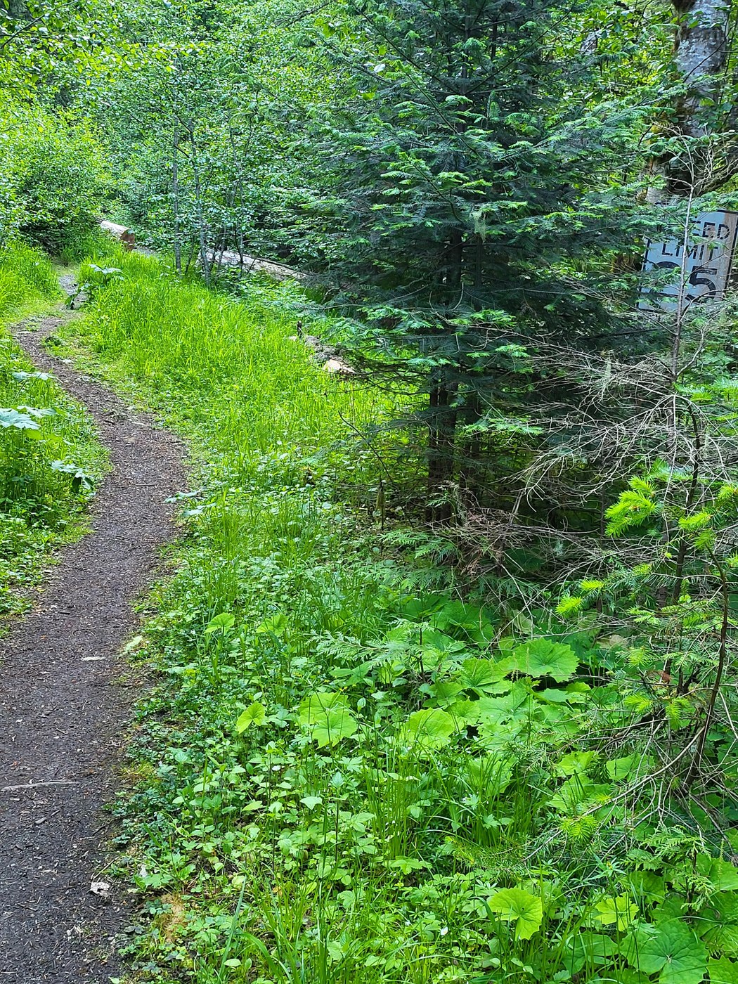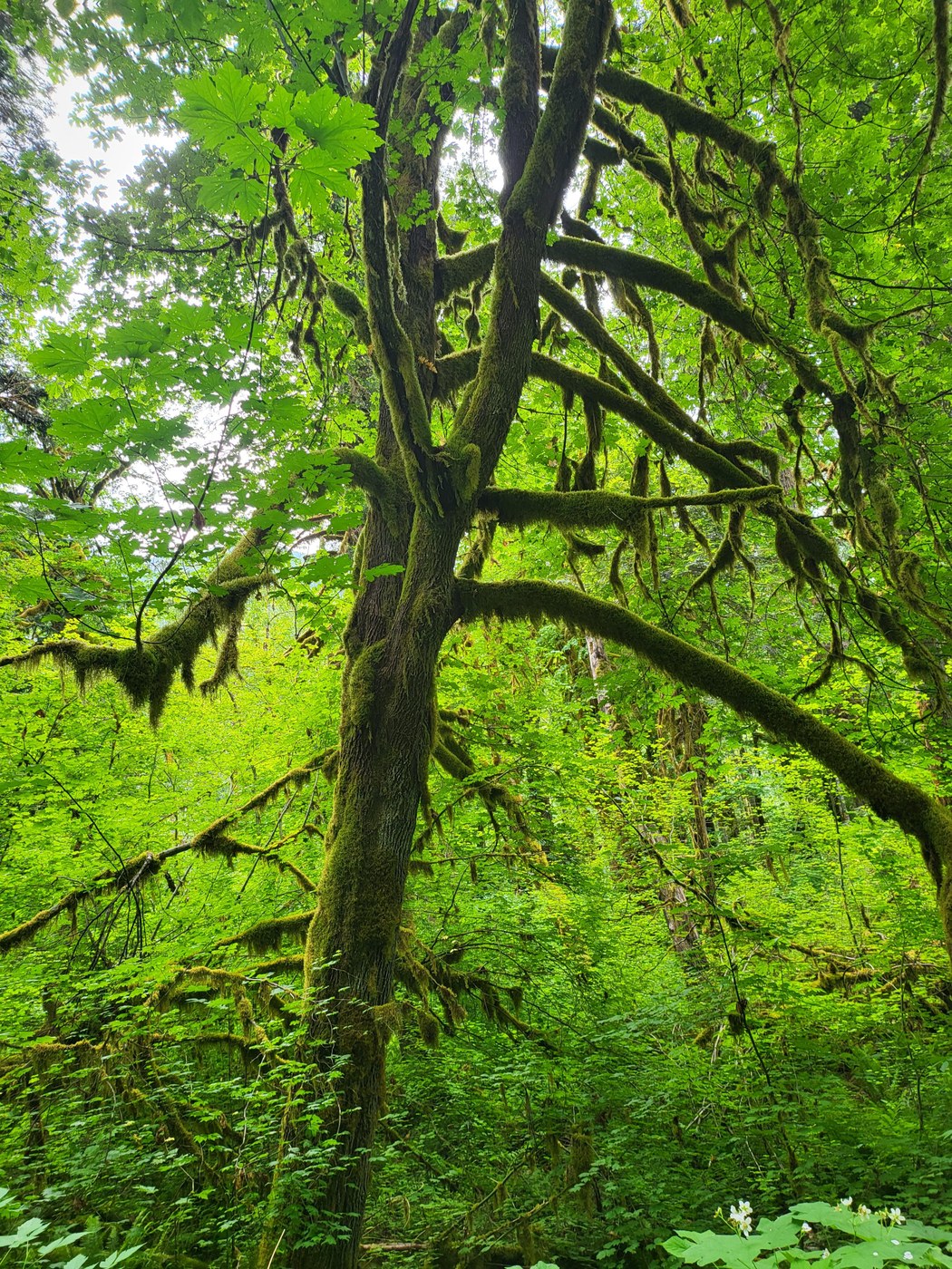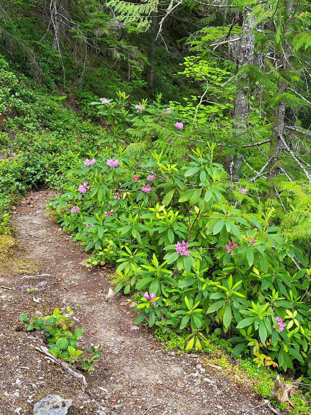 My husband and I take advantage of our retirement status to hike midweek so crowds were non-existent. We backpacked in to the old car camp Monday, day hiked to Big Timber and back Tues, and hiked out on Wed. The log blocking the trail described in an earlier report is now gone. I was delighted by the variety and quantity of wildflowers. Before the Dosewallips CG there were honeysuckles, paintbrush, star flowers, twin flowers, paintbrush, goats beard and many, many more. We ate handfuls of salmonberries. There are a zillion thimbleberry bushes with flowers but no berries yet. On the way to Big Timber there were wonderful pink rhodis in bloom. All along the trail, the waterfalls are fantastic. There were no issues with creek crossings as far as we went. This is forest bathing at its best!