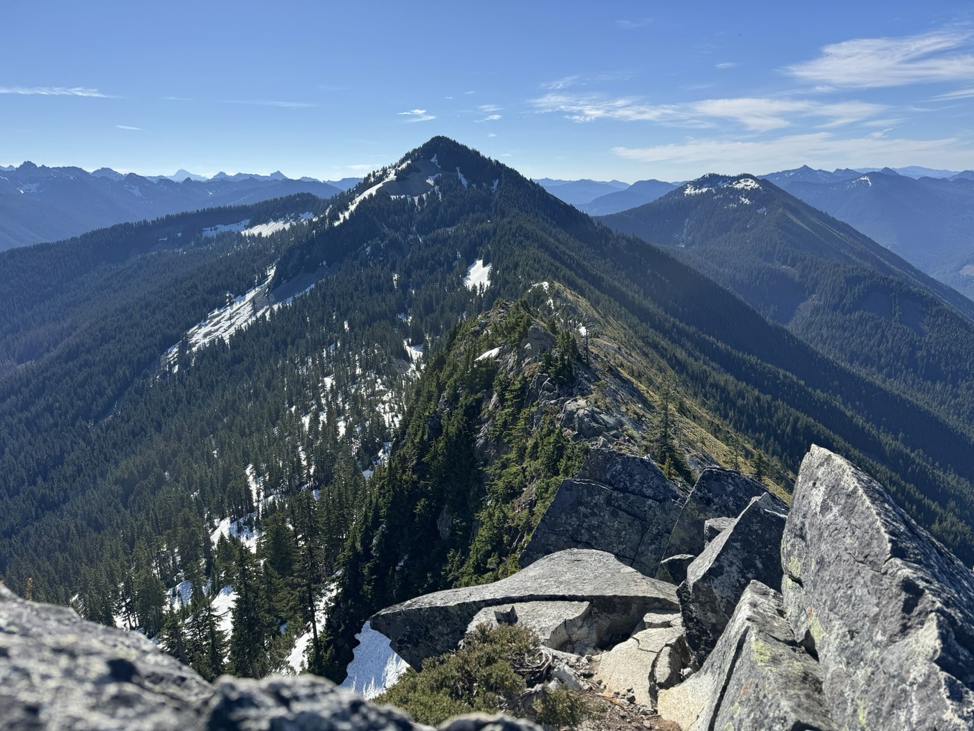 Spur to the top of Defiance was virtually snow free (as was the entire trip to that point). From that part of the state, atop the ridge on a clear day, you can see Rainier, Adams, the Olympics I. The Distance, Stuart, the whole Alpine lakes complex, Glacier, Baker and a zillion more. Probably the best ridge hike this side of Kendall Katwalk.