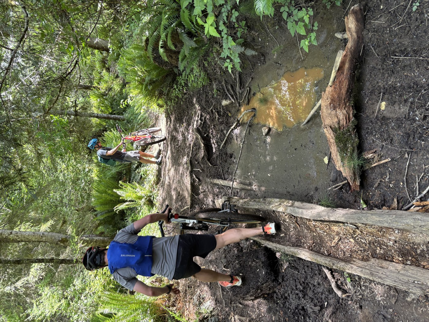 The foothills trail from Carbonado to the Fairfax bridge is in excellent shape. Low-skill mountain bikers like ourselves had no issues. The next two miles after the bridge had a few muddy areas that some of us chose to walk while others rode. The final 1.5 miles got a bit more bumpy and twisty and awkward, and I was definitely walking my bike more than riding it. We took an hour of moving time to get to the Kolisch Rd bridge.