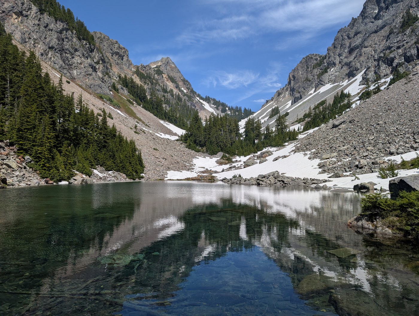 To get to the upper lake, or the camp sites on the other side, you currently need to cross some snow fields on the west side of the lower lake. This wasn't too difficult for us using poles - the main problem was punching through the snow to the talus. The crossing can be a bit scary, though, given that a slide would land you in the lake! This should be mostly melted out in about a week.