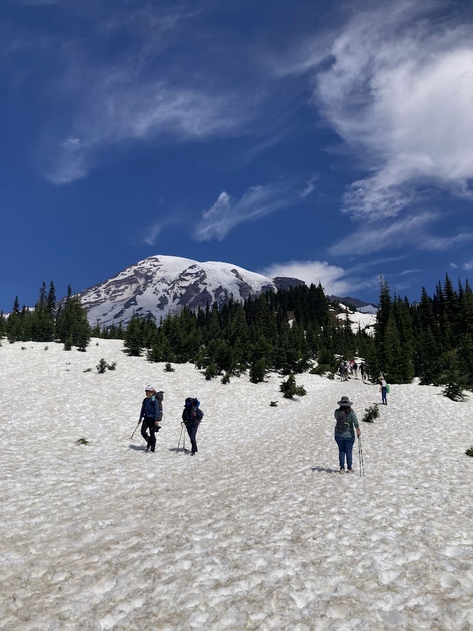 The "snowfields to cross" selection for snow conditions above is for Paradise, which is completely covered in snow still. We went up with that in mind with a visiting relative who wanted to just see Rainier up close. We hiked just a tiny bit (in regular running shoes or hiking boots, among our group.) Poles helpful as it's squishy/slushy (at least on the parts of the trail closest to the parking lot.) I saw one group going up with snowshoes but I don't know if they are needed. I even saw a few people in sandals ... not sure I'd recommend that.