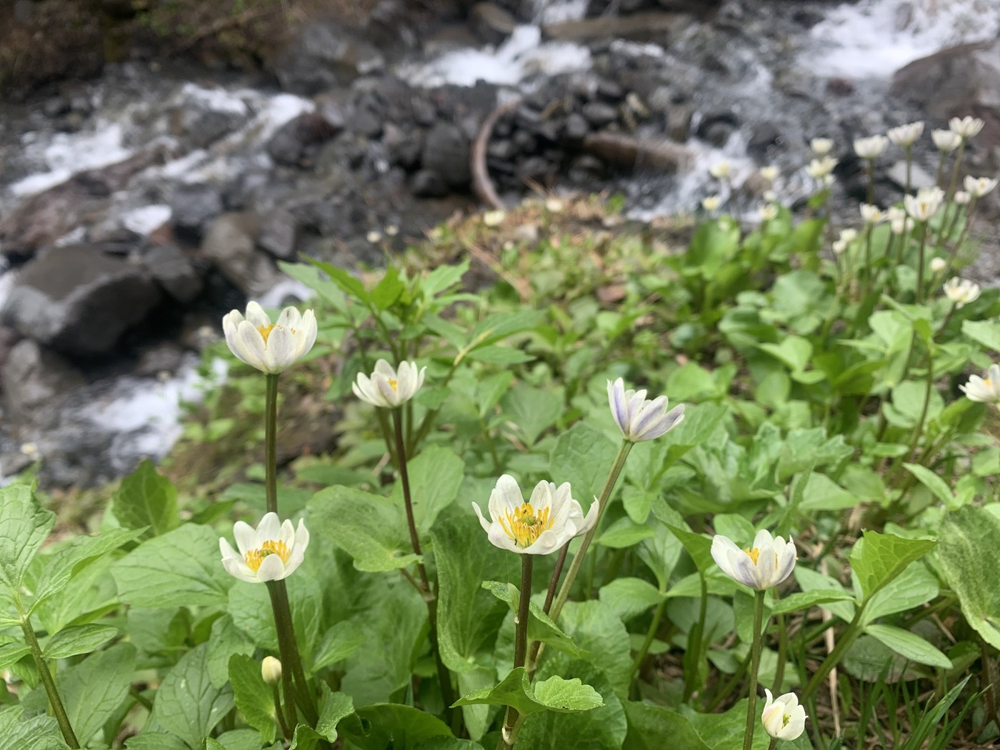 I saw 3 marmots and lots of marmot tracks up high and some band tailed pigeons in the woods. There weren’t many flowers, but there were some very nice marsh marigolds. It was socked in most of the day so it was a great hiking temperature. It never rained and a timely sucker hole showed up when I was at Survey Rock.