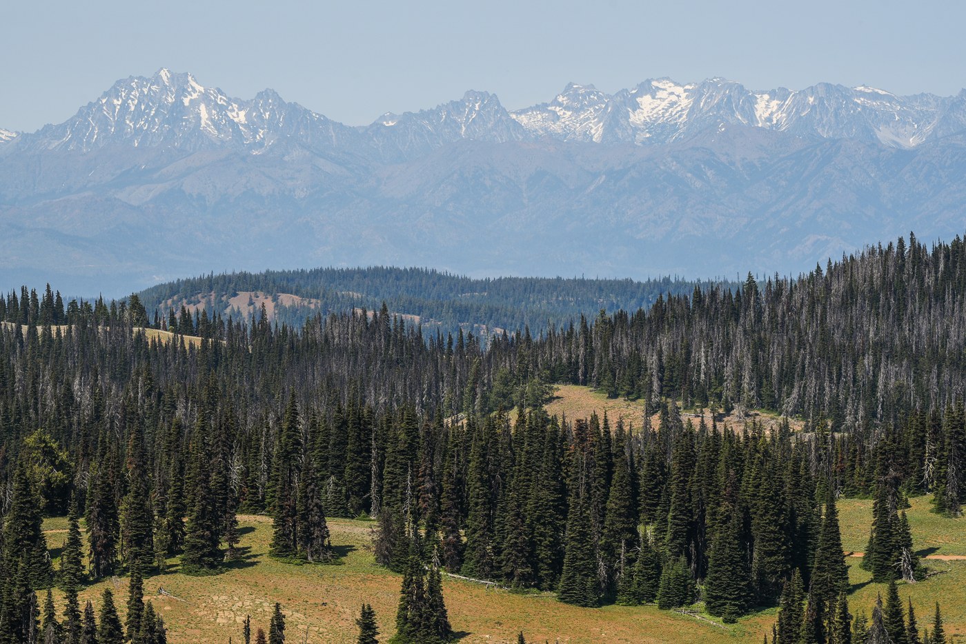 After reaching the end of the single track trail at about 1.2 miles, we continued uphill on a 4WD road, eventually turning right on the road that leads out to Bald Mountain. This last ~1 mile provides stunning views south toward Mt. Adams and the Goat Rocks, west toward Mt. Rainier and the peaks of the William O. Douglas Wilderness, and, as you approach Bald Mountain, north toward the Stuart Range. Skies were a little hazy today, but the Bald Mountain summit offers one of the most expansive views anywhere in the area. We hung out here for an hour or so, enjoying the views and wildflowers, and letting our one-year old get out some energy after being stuffed in the hiking pack for most of the day.