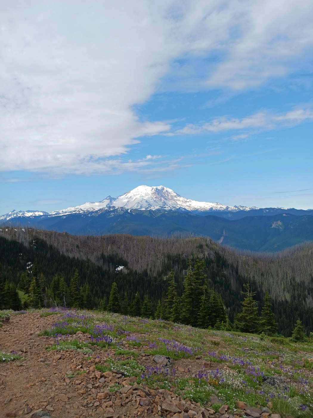 This trail is very nice. It is mostly in the forest and not very steep for the first roughly 1.75 miles. Plenty of ups and downs through a forest that has obviously suffered from fire fairly recently. A few intermittent views of Rainier along the way and a few blow downs. None are deal-killers but a couple need a bit of care.