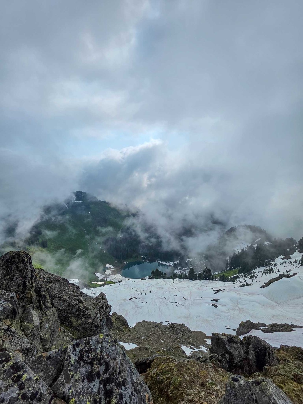 Got to the trailhead around 6am and was the only person there. The road up is actually in really good condition with few potholes up until the last quarter mile or so to the trailhead. There are spots to park prior to that if you don't have a high clearance vehicle. The switchbacks gain elevation steadily and I imagine on a clear day you'd have amazing views the whole way up. Even though it was foggy and visibility was poor it was still a beautiful hike through all of the wildflowers. Once you reach the top of the switchbacks you start to hit some snow fields. I made it to the summit although in hindsight it was not very safe and I probably should have turned around once I hit the snow. There were a few short sketchy sections in particular along the ridge on the way to the top. The path through those sections was narrow and the snow had partially melted around the trail and some large rocks forming bridges. I tried to avoid one of these sections on the way down by walking along the gravel above it (bad idea, its a lot steeper than it appears in the pics) and ended up slipping since the gravel gave way underneath me, which could have been very very bad if I was closer to the edge. Just need to be very very careful or ideally wait a few more weeks for it to melt out.