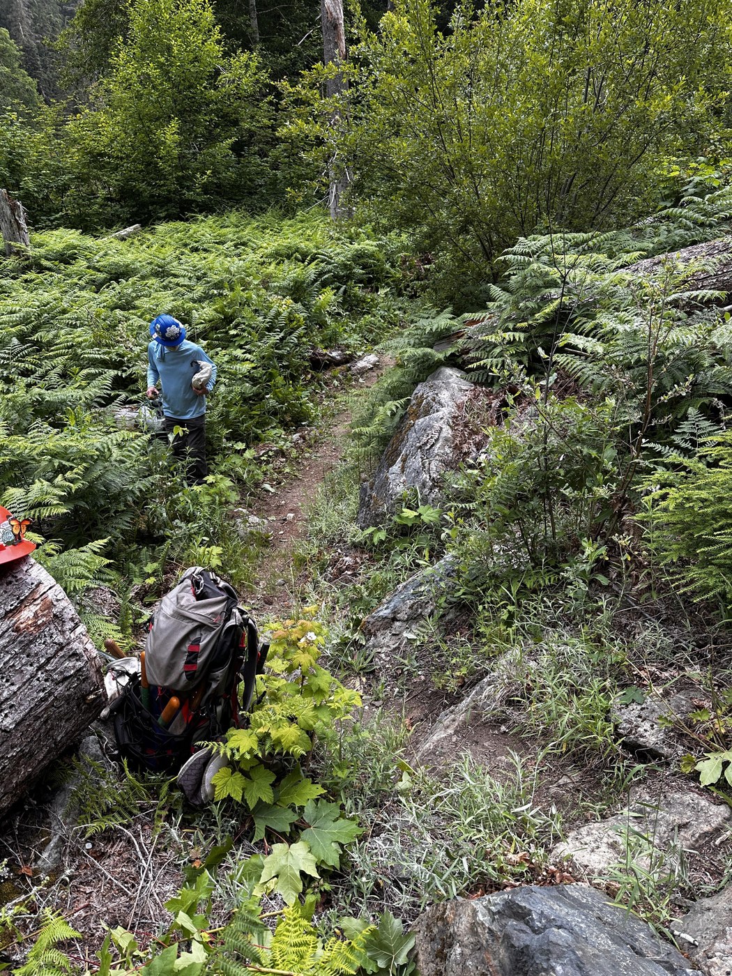 Our work party goal was to remove 2 large trees that had fallen across the trail above 5-Mile camp. We cleared those trees and a few smaller ones encroaching on the trail. We did disturb a bees nest and suffered the wrath of the owners. That tree was left by the side of the trail. We brushed our way back to the trailhead and that is where I picked up a hitchhiker - TICK! So be sure to do a careful tick check once you are back at your vehicle. Mine was at my waist probably because I was taking off my pack, placing it off trail while brushing a section, then putting it back on without looking for hitchhikers. The wild huckleberries were just starting to ripen and they were tasty!
