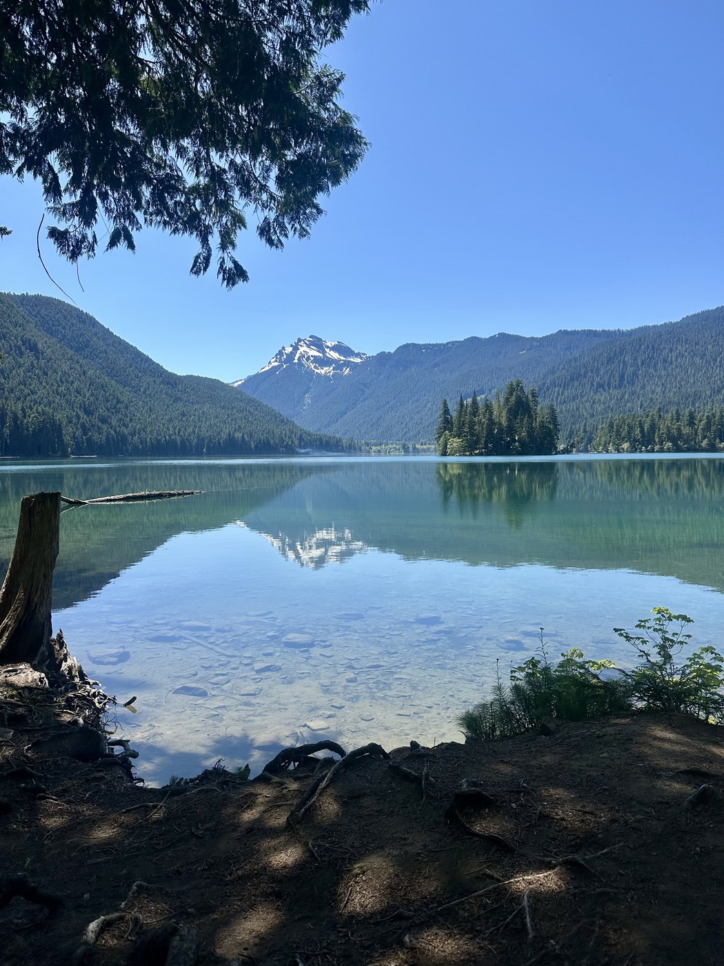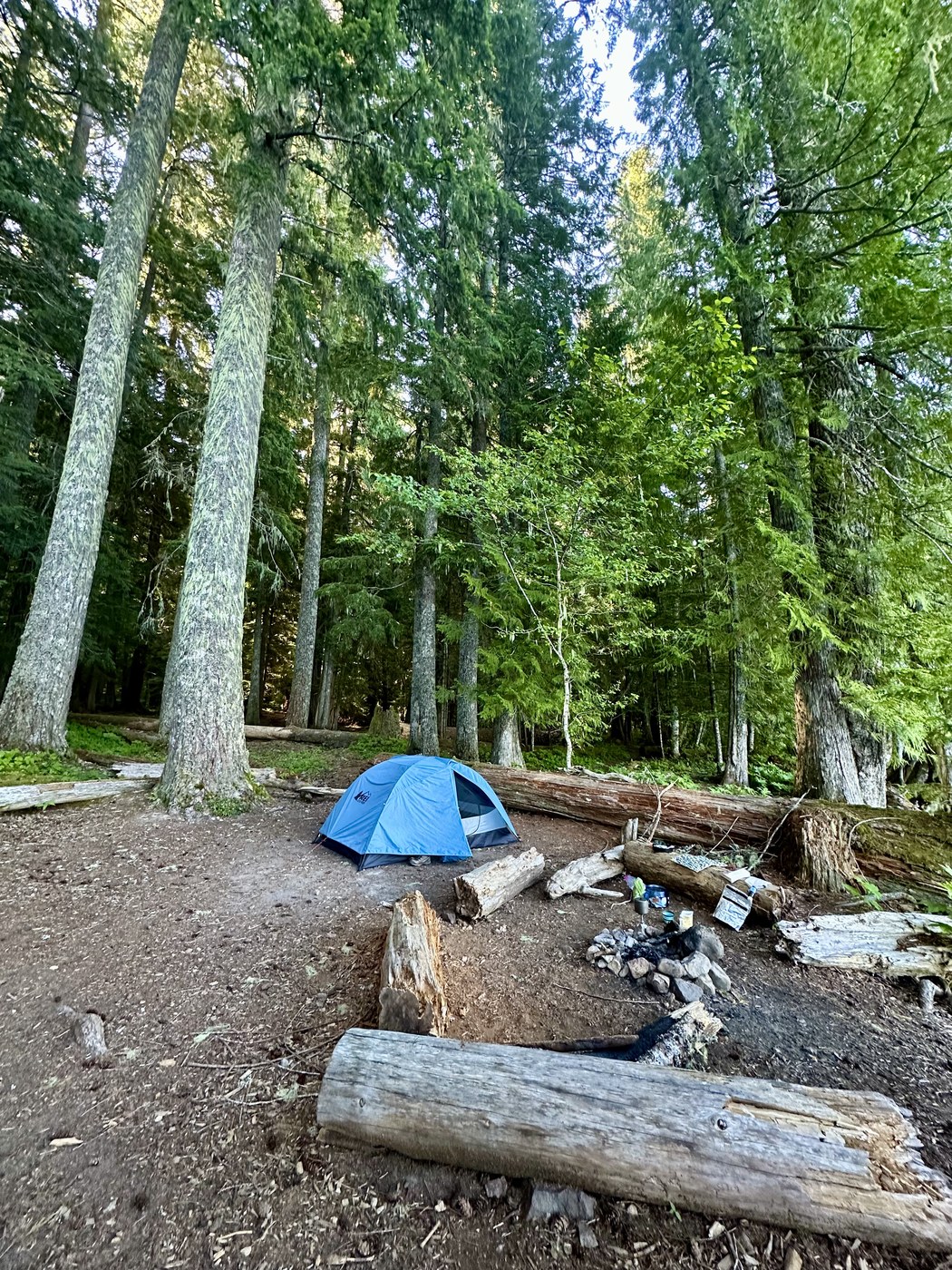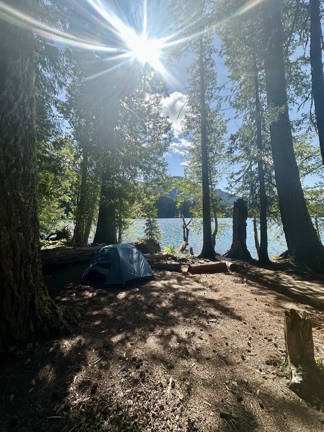 I arrived at the trailhead around 1 pm on Saturday. The parking lot was full and after reaching the very busy lake, I grew increasingly anxious I'd started too late and wouldn’t find a spot to camp. There were tons of gorgeous sites; they were just all occupied. But 1.9 miles past the old ranger station, at about 3:30 pm, I found a lovely spot on the water with a peekaboo view of Rainier. It felt like one of the last sites on the trail, and I wouldn’t have wanted to start my hike any later in the day. Then again, I did see one or two other groups arrive after me and they seemed to find something workable. All to say, don’t lose hope. Keep hiking because there are probably more campsites ahead. And if you’re heading out on a sunny weekend, get an earlier start if you can! I clocked 6.2 miles in each direction.