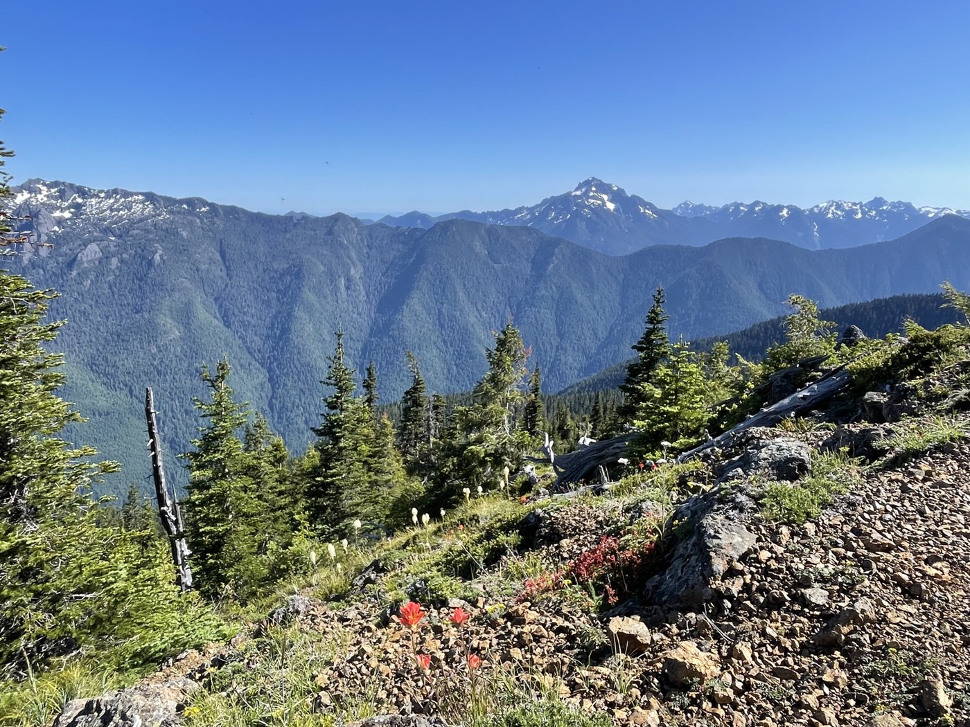 We started from the Tunnel Creek trailhead. Make sure to use Google maps because Apple will not show this route. The road has a few deep potholes and some loose rocks but they could be avoided and our sedan made it without a problem. The hike starts off very gentle through the forest along the creek. At 3 miles the trail crosses a log bridge and starts the climb. It was pretty relentless uphill after that with a few sections that have a steep grade. We climbed up to the peak and found that the peak trail was a bit brushy in places and also has some loose rocks near the top. Poles might have been helpful because this section is very steep. There were wildflowers blooming and the views were pretty incredible. We could see Rainier, Baker, Glacier and many of the North Cascades clearly in addition to all the Olympic peaks. Definitely worth the push to the summit. There are quite a few flies from the lake up to the summit and they were annoying us quite a bit at the top, so be prepared for that. Definitely recommend this one on a clear day!