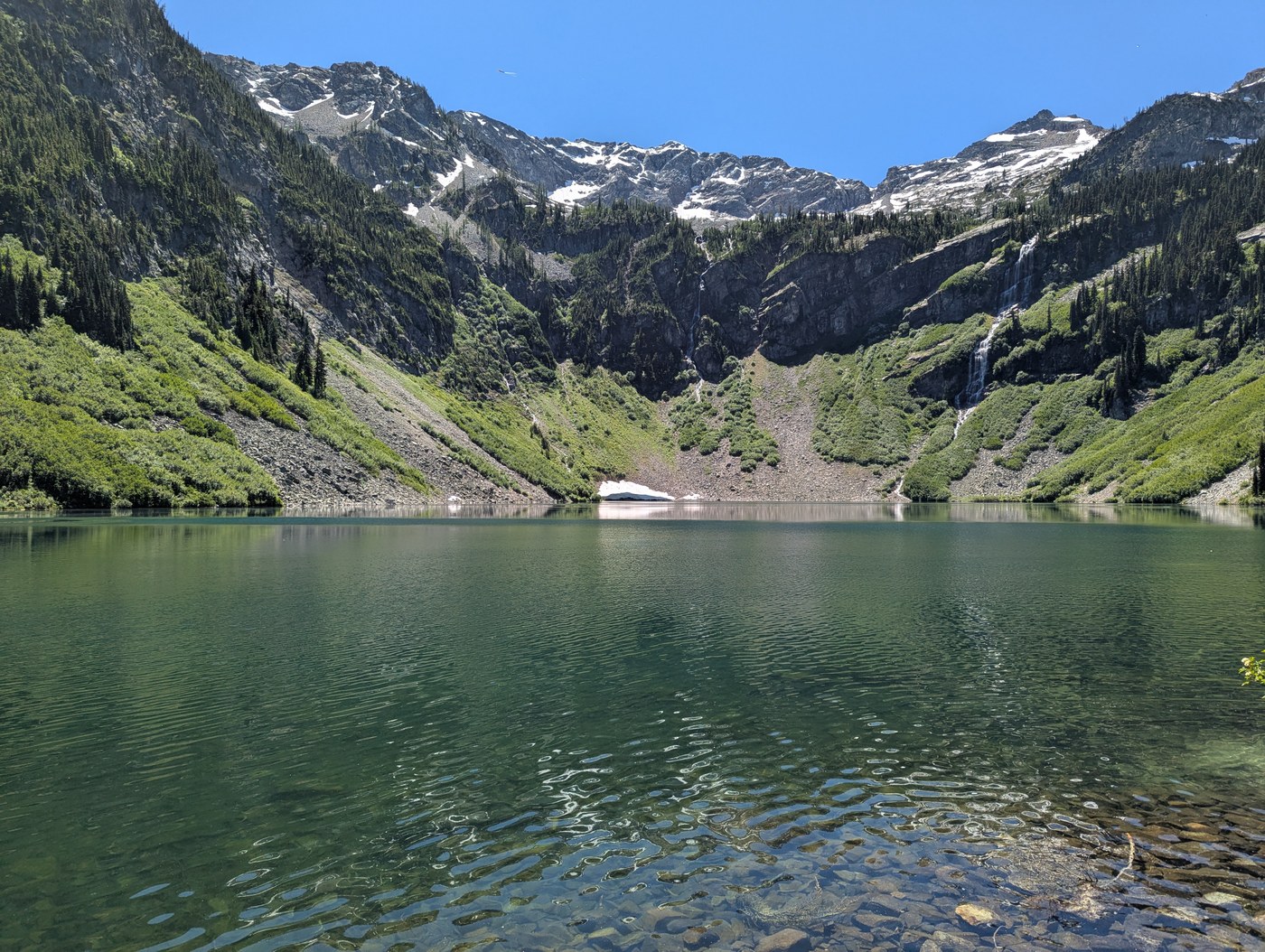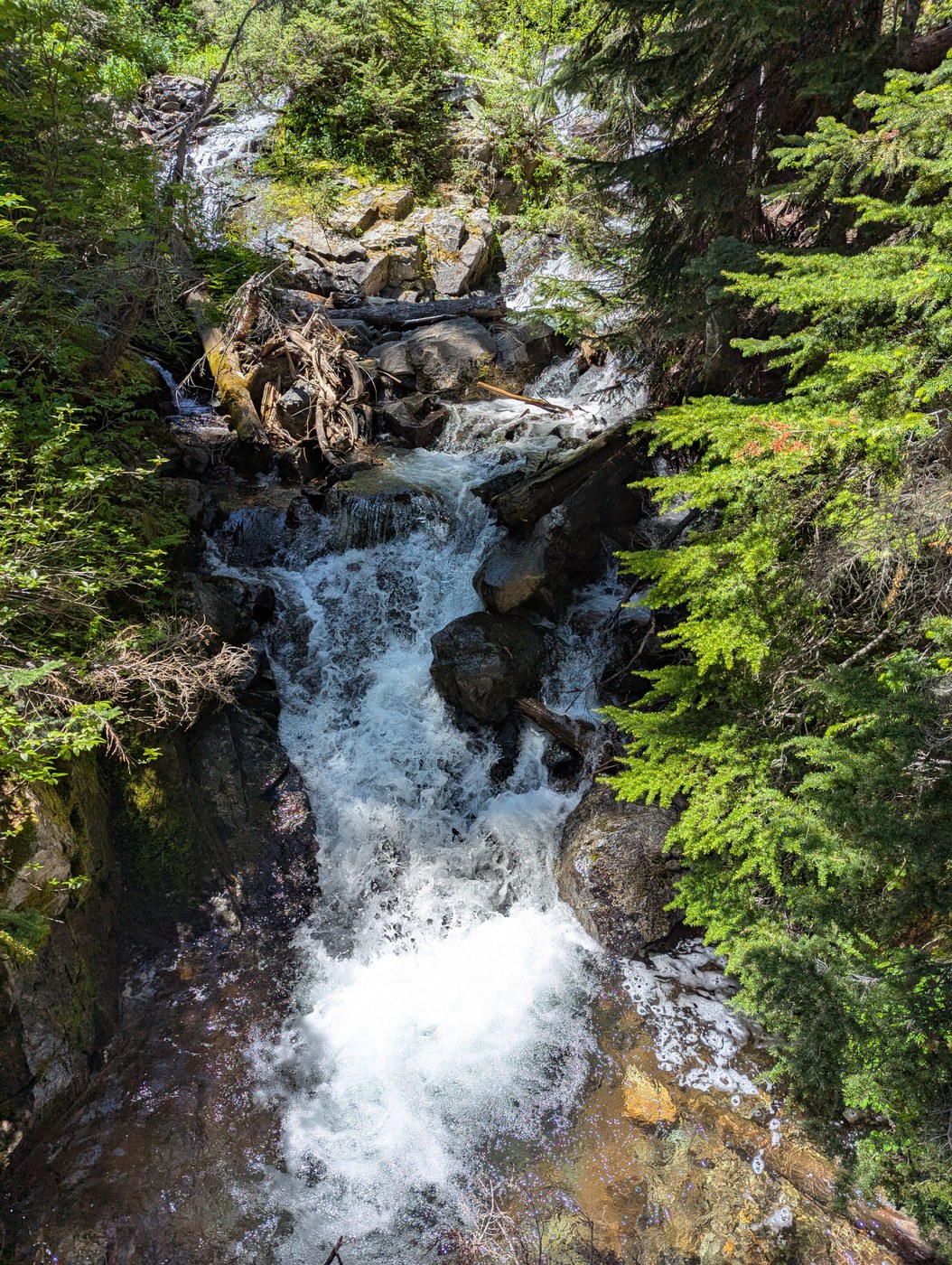 This paved trail has an easy grade and crosses a couple of bridges over beautiful streams. The trail is nice and shady with some big benches for taking a break. The lake is beautiful and there are places where you can get in for a swim, if that appeals. There are also some benches at the lake.