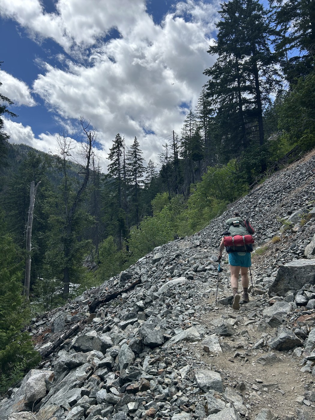 My friend and I went on a peaceful, one night backpacking trip along Ingall's Creek. We found a perfect spot along the river about 2 miles up the path, set down our stuff, and then continued on to hike up the trail. We heard and saw a few rattlesnakes, one a few feet from the trail, and another one that slithered across the trail and out of the way. It was quite the adrenaline rush! We also saw tons of checkerspot butterflies, a chonky merganser hanging out in the river, and some cute salamanders (?). It was relatively quiet for a weekend, and will definitely keep this trail in mind for future backpacking adventures. Would love to return and make it all the way to the lake!