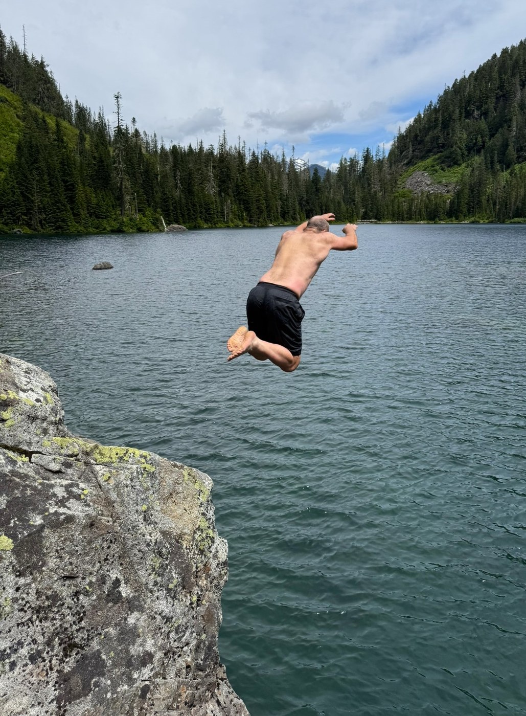 For such an accessible place, the lake is gorgeous. The snowfields have receded. Snow tunnels are still present but too high up the scree to be accessible. That big rock at the cliff end of the lake is ideal for jumping off. Water temperature is cold, but swimming is still good. Wild flowers are everywhere but few berries as yet.