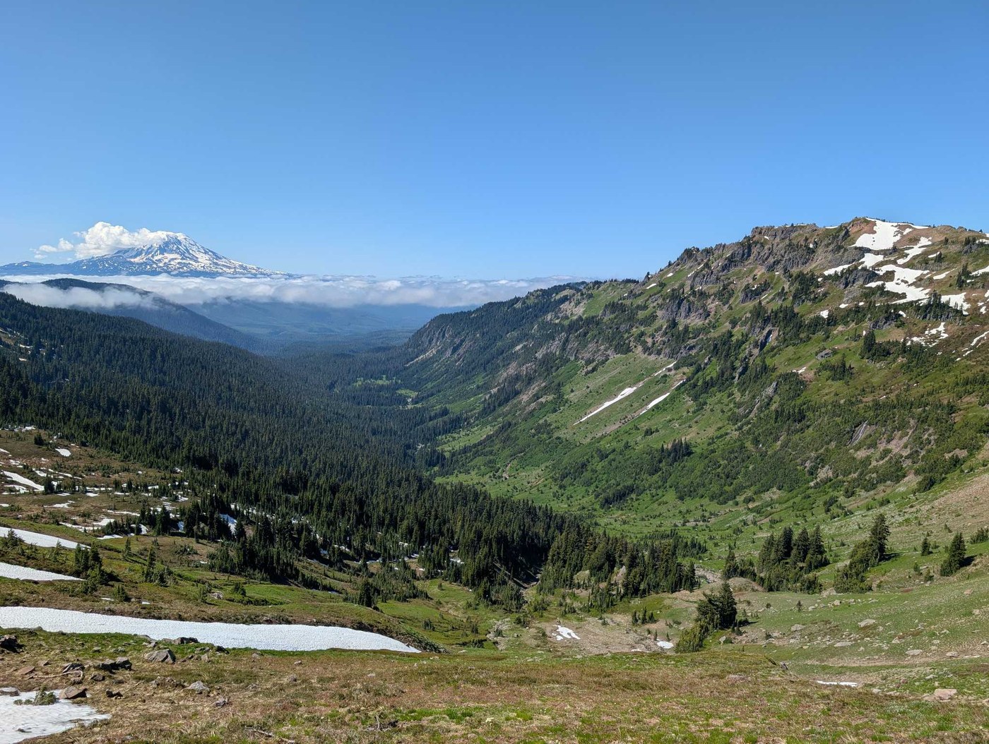 There's nothing much to report about the trails at lower elevation and in the trees. There were bugs, but not too bad, and a few trees down but also not too bad. The trails were otherwise in good condition.