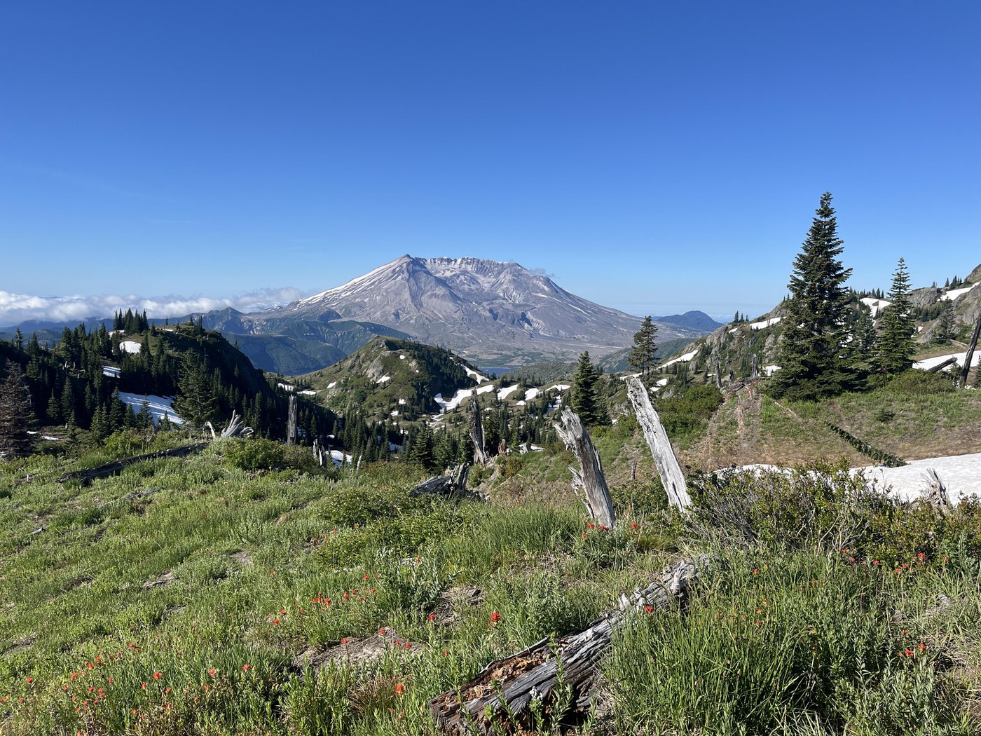 Heading towards Coldwater Peak the snowfield crossings got a little dicier but still fine. Beautiful snow patches on rolling green hills. St. Helens Lake was beautiful framed with the caldera. Coldwater Peak was fine but wasn’t anything more than Mt. Margaret.