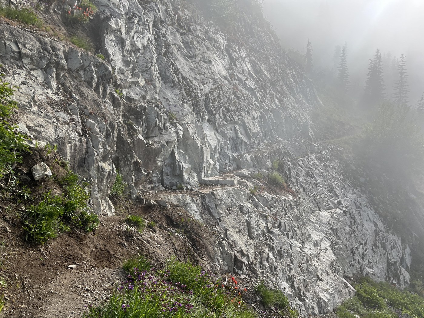 Boundary trail up to Mt. Margaret was beautiful! Lots of birds near the trail in the morning. Legs were wet from brush, pants were helpful, but the trail wasn’t overgrown (yet). There’s one mildly dicey section (picture), minor washout right before a section cut into a rock wall. Take one step down following the bootprints, one step back up, continue along the rock trail.