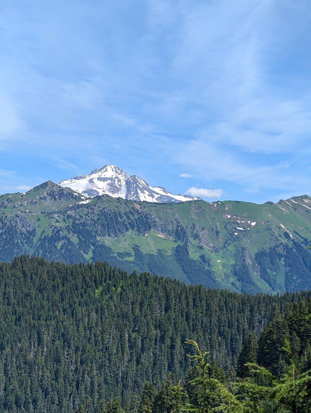 Day 1: I camped about a mile from the trailhead Thurs night and started my hike in earnest on Friday, July 4. Crossing the North Fork Sauk River was easy as there is a very large log fallen across the tree, and it's been cut/flattened on top to make it easier to walk across. It's high enough above the water to not be too slick. After that the trail ascends relentlessly up towards Pilot Ridge. On this ascent there were two spots where there were a couple blowdowns that obscured the trail enough that having a .gpx track downloaded was helpful, but generally the trail is in good shape, though steep. The trail crosses a raging stream at ~3800 ft that is probably the last reliable source before Blue Lake. Early in the season I found a couple streams after that, but nothing after reaching Pilot Ridge itself. The hike along the ridge is beautiful and you can look across the valley and see where the North Fork Sauk River Trail meets the PCT on the long, open slope between White and Red Passes (see photo). I ended my first day at Blue Lake, which is a gorgeous campsite but filled up early on the holiday weekend.