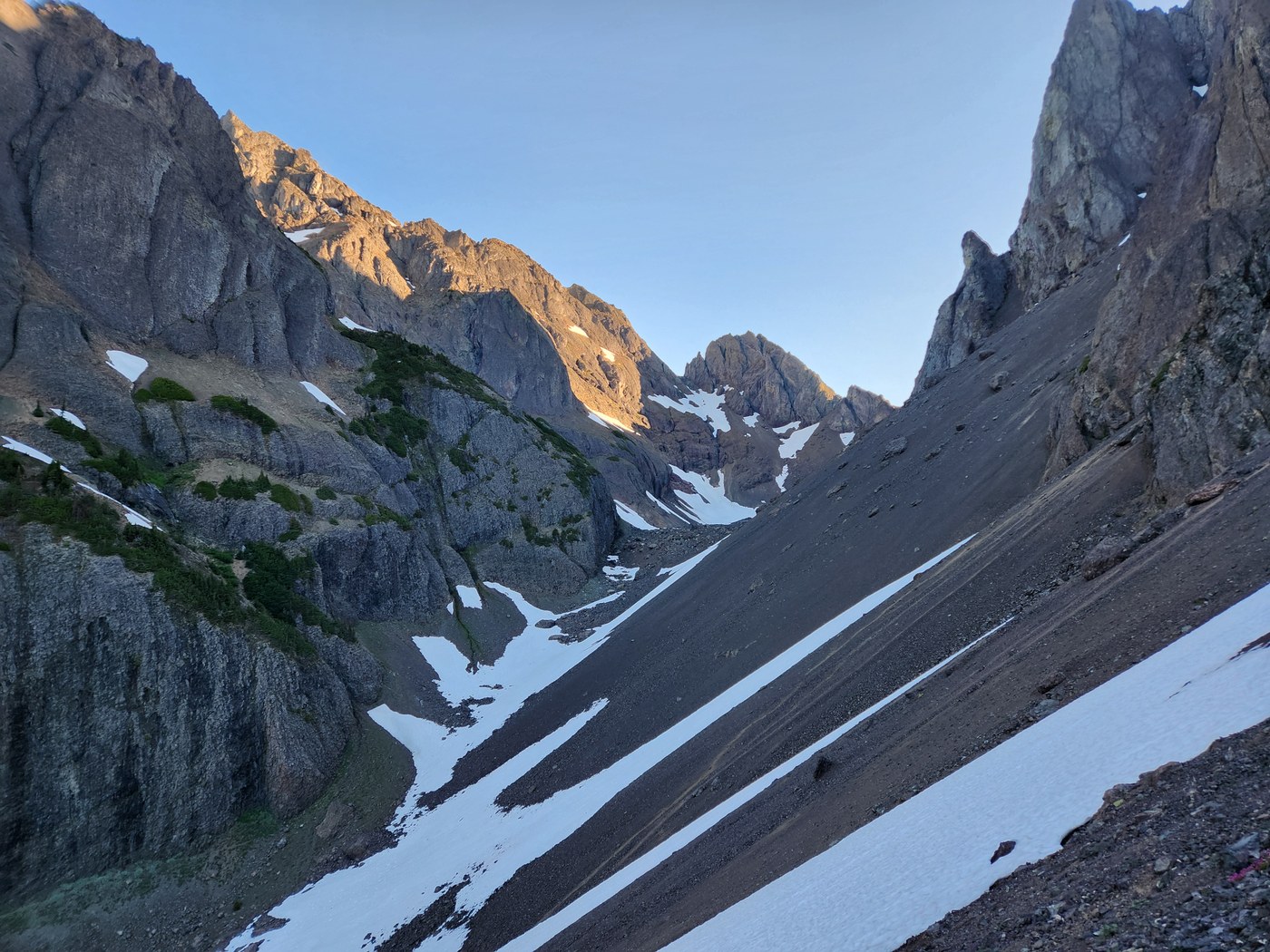 Attempted a summit of Mount Constance. Started on Sunday, didn't take too long to turn off the Dosewallips Road Trail to the steep Lake Constance Trail. The first 3rd and last 3rd were definitely the worst part of it. Lots of scrambling over logs and rocks, and in the last 3rd, lots of cliffs and holding onto trees and roots to make sure you don't tumble off the edge. Not too bad going up, worse going down in my opinion. Spent a night at the lake and woke up the next day at 4 AM, started going a bit late by 530. The walk through Avalanche Canyon wasn't too bad, and we soon arrived at the south chute. Lots of loose scree and rock on this part, definitely took some maneuvering too. Heard another report about a large rockfall a few days before, and I could definitely see this happening with how bad the scree was. We made it past the first large scree field, gaining around 1500ft from the bottom. We then went over top a ridge and descend into a small valley and to the 2nd scree field, which was more difficult. We stayed to the left as the gully narrowed, which was really the only way to proceed since the scree was so bad on the right. Near the top, approaching the Notch, the scree was difficult to navigate because of how loose it was. Unfortunately at the top of the Notch we decided to turn around because some of our team were uncomfortable with the previous scrambling and the exposure of the continuing route. The way back down wasn't too bad since you could glide/ski down the scree. Took us longer than I would've liked to get down, but we made it back to camp around 2 or so. We then packed up and hiked down the Lake Constance Trail, where the first bit on the way down was the worst, especially with a heavy pack and some exposure. Made it down and back to the cars around 8. Overall pretty difficult hike to and from the lake itself, and the actual climb on the mountain is time-consuming and difficult, especially with the scree. From what I've read, the rest of the route after the Notch has lots of exposure and climbing. Did not use my crampons or ice axe, since there were so few snow fields on the actual mountain.