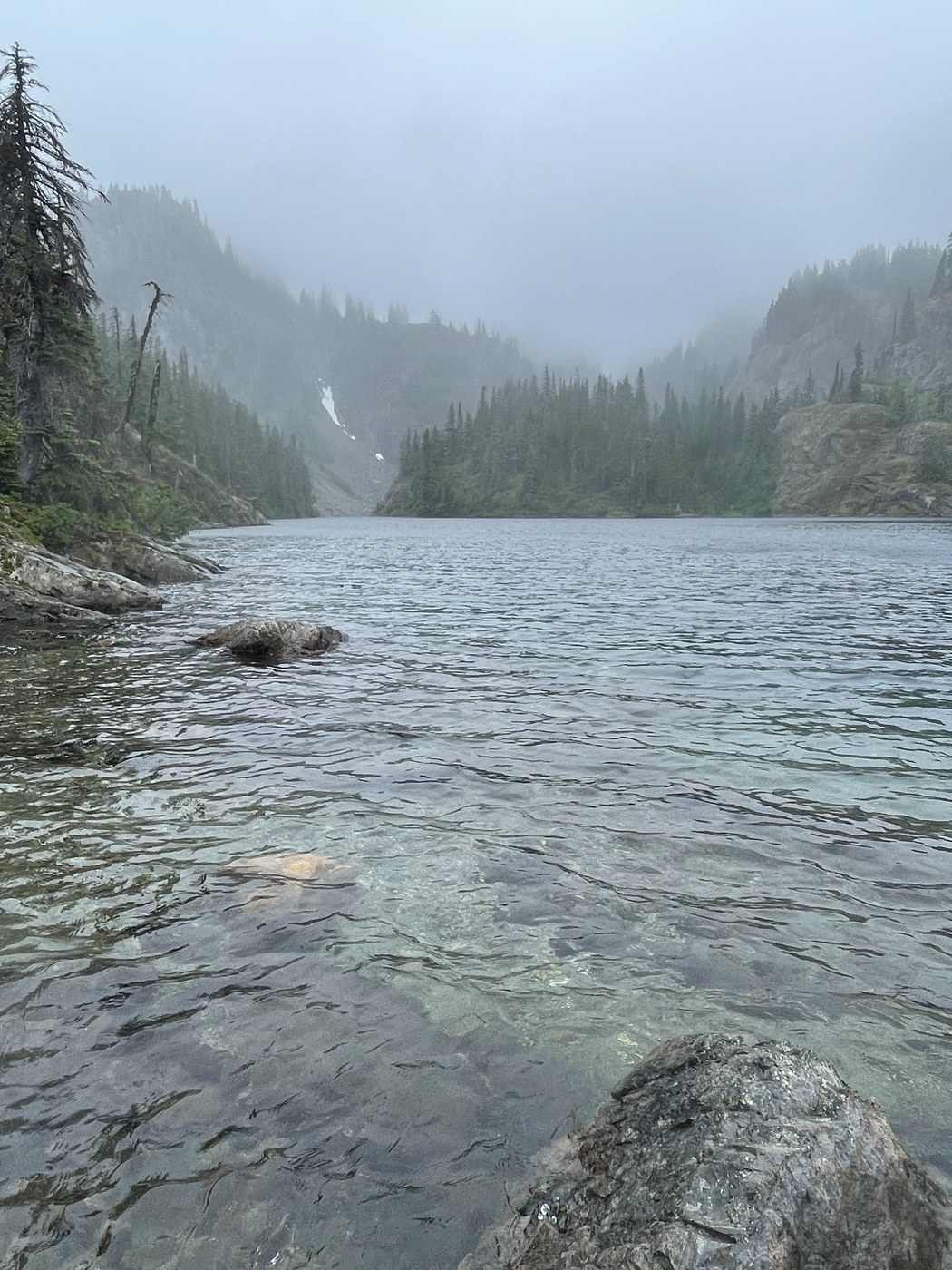 My plan today was Alta Mountain or Alta Mountain Tarns, but by the time I got to Rachel Lake it was windy and rainy and everything above the lake was in the clouds, so I turned around at the lake.