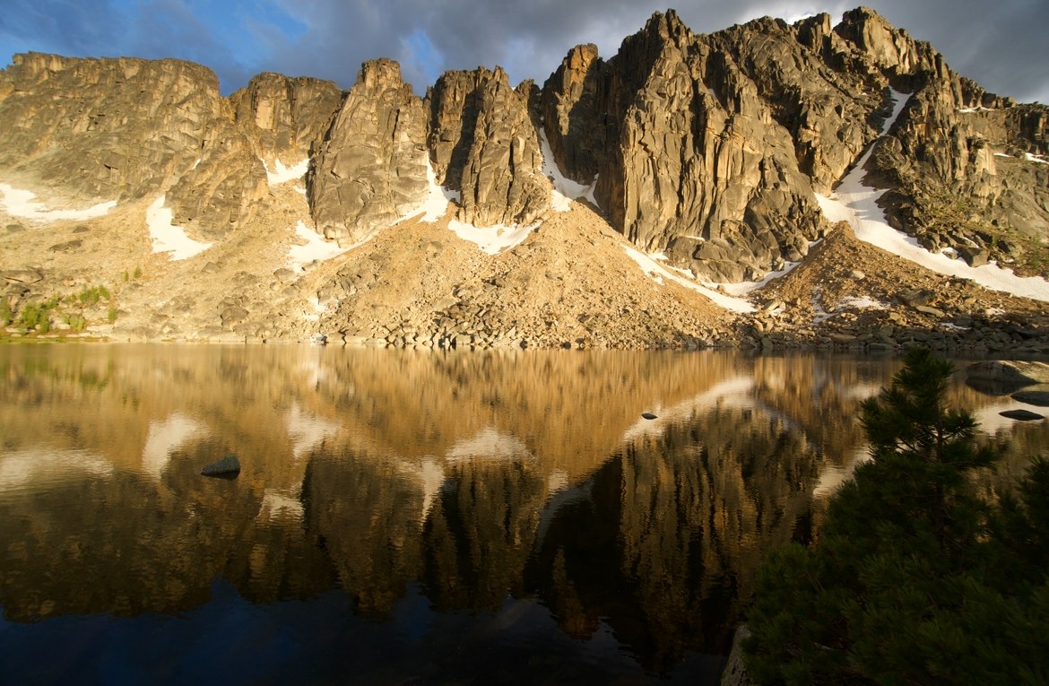 The second morning we arose early knowing we had a long 18 mile day ahead of us. Moving quickly across the remainder of the exposed ridgeline we dropped into the forest. Popping in and out of heavy tree cover we made our way to Upper Cathedral Lake. Water sources were beginning to get scarce along the route due to an early snow melt. Along the way we took time to stop at the historical Tungsten Mine site where the original bunk house and some of the mine machinery are still present. Arriving at the end of our day we climbed to the top of Cathedral pass where the views are stunning! Upper Cathedral lake is like nothing else in the Pasayten. A towering cliff band aptly named amphitheater mountain borders the lake giving it an otherworldly feel.