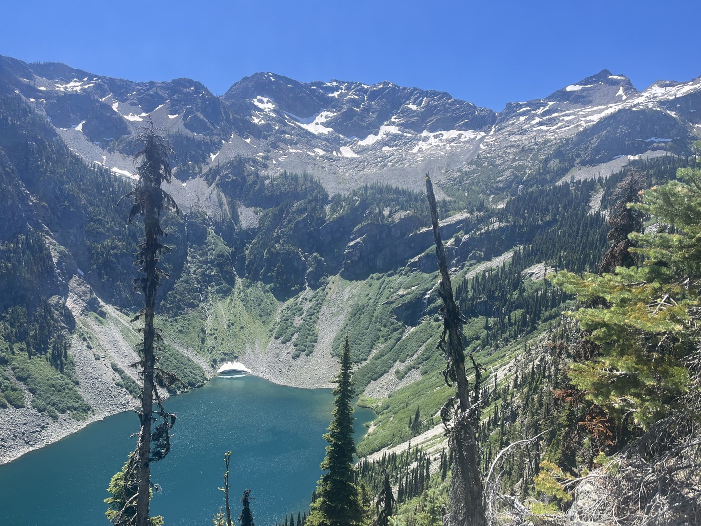 We arrived at the trailhead around 8:30 am and were able to grab one of the last parking spots - several hours later there were long lines of cars on Highway 20 as usual. For all the crowds that love this hike, we only occasionally encountered other hikers, in part because most of us do this hike in a counter-clockwise direction that spreads the crowds out. The trial is in excellent shape throughout, and the great repair work of the Methow Trails Collaborative and others is evident - thanks! This is a great time to enjoy this gem, as the entire trail is now show-free and the waterfalls flowing into Rainy Lake are on full display!