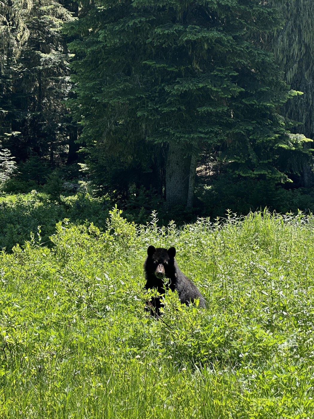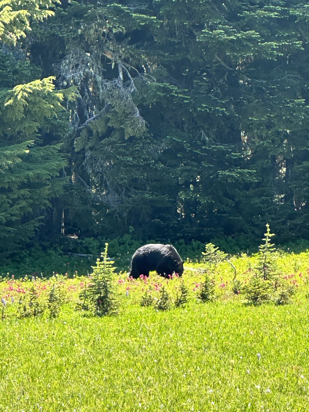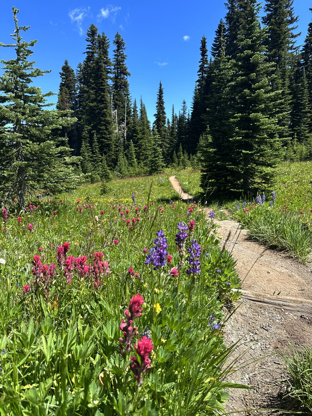Amazing day!!! We saw 4 bears including 2 tiny cubs and so many wildflowers. Bugs were little annoyance in meadows but none in grand park and minimal on way down. We turned left at junction and went a bit for 10.3 miles. Very gentle and beautiful trail.