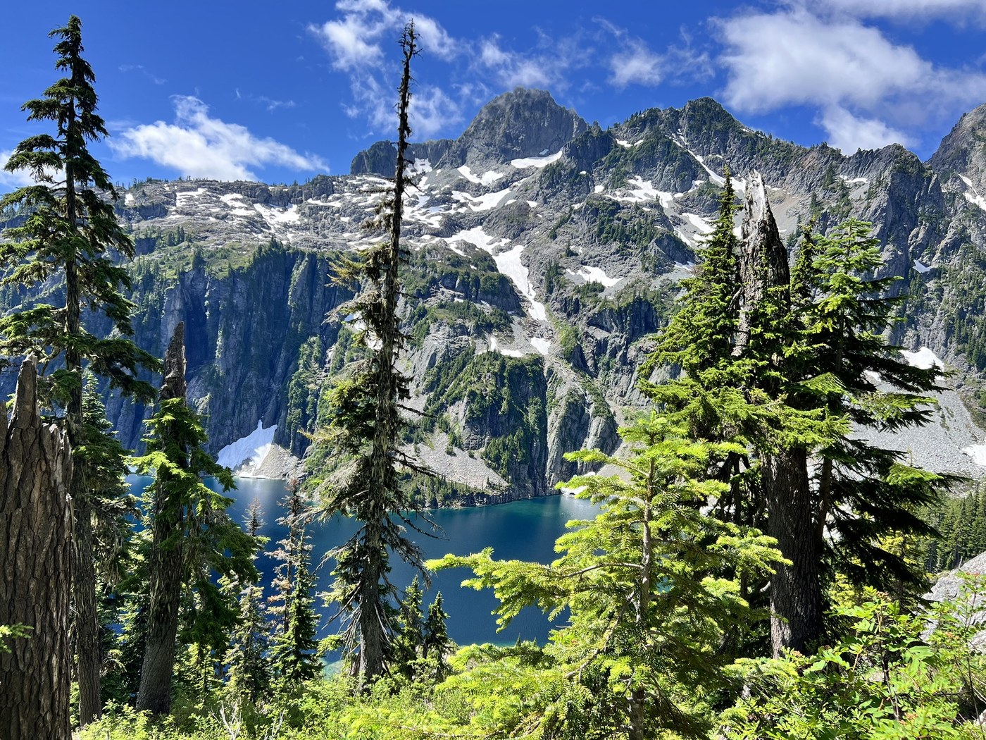 Once you hike around Gem, you descend immediately over many switchbacks. There’s a short stream crossing to a talus field that was easy to navigate using the existing cairns. The next part of the trail is the most overgrown, but you’re still able to follow a trail without issue. There is a single blow down you have to climb over while the others have become part of the trail. Lower Wildcat is nice, some members of our group went around and scouted some of the campsites there (I think there were two). There are two stream crossings with muddy/slippery rocks that all members of our party used trekking poles to navigate with dry feet. After that we started a steep but short climb up to Upper Wildcat Lake. We met a trail runner that said they had seen a bear, but we did not. The lake is magical and lovely and was mostly bug free. We spent the afternoon here with the lake to ourselves, swimming, lounging, and fishing. There seemed to be about three campsites here that we found. If we were to come back, we’d probably head straight to Upper Wildcat Lake for the solitude and fewer bugs.