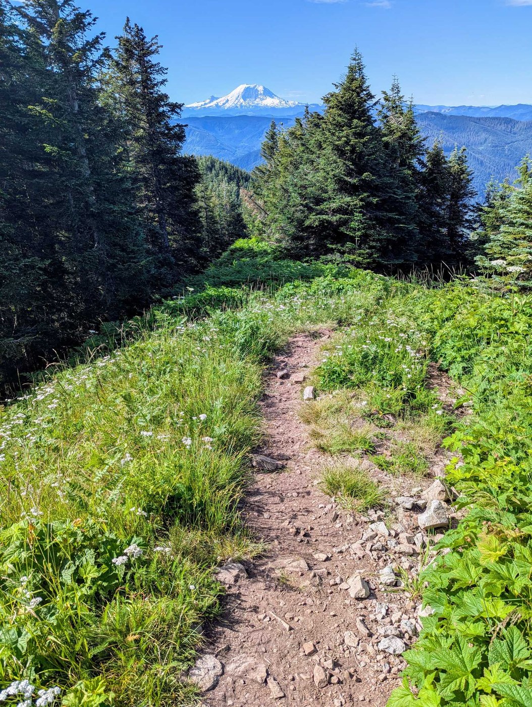 A rough and somewhat overgrown trail with a great Rainier view payoff at the top.