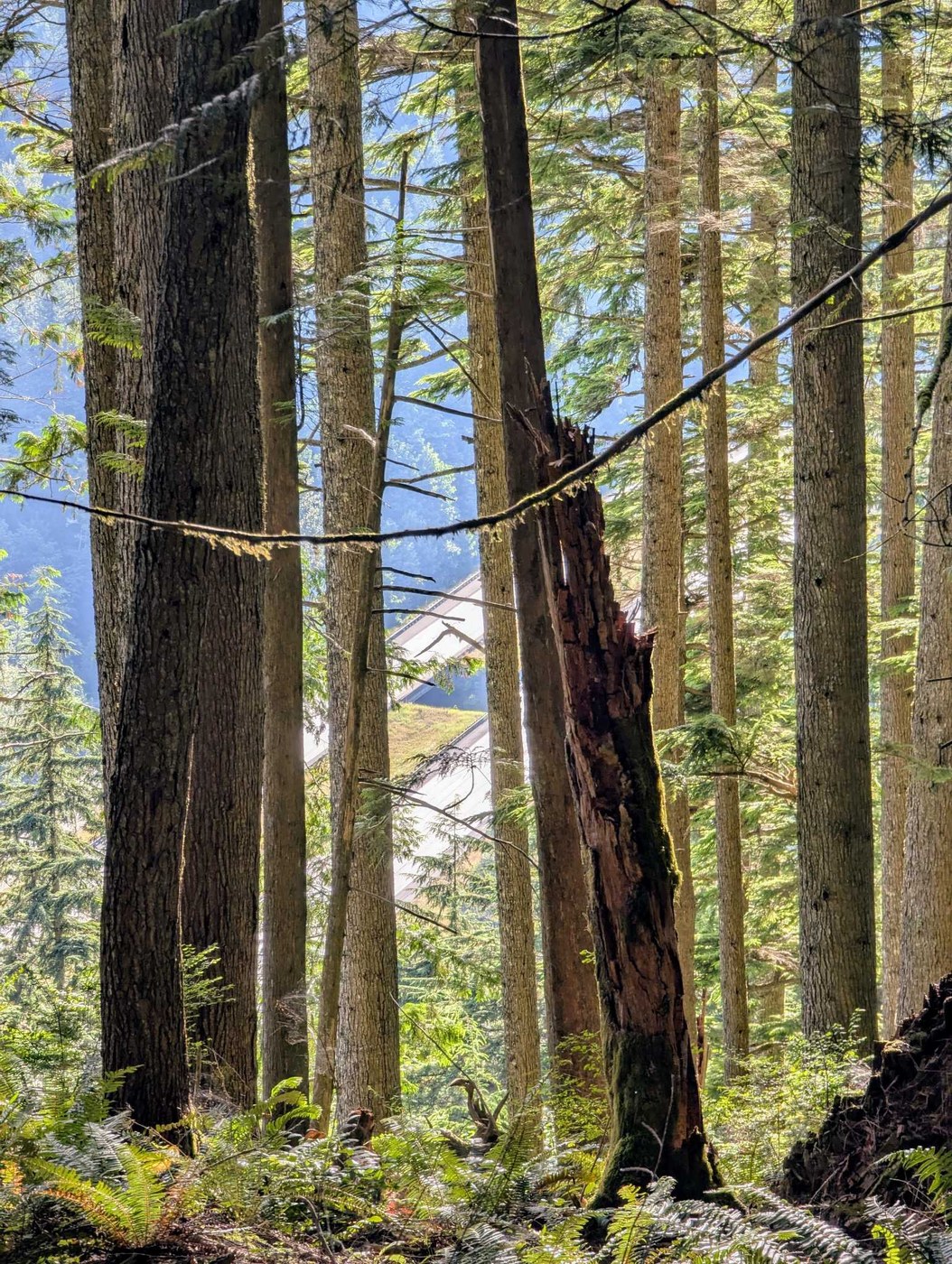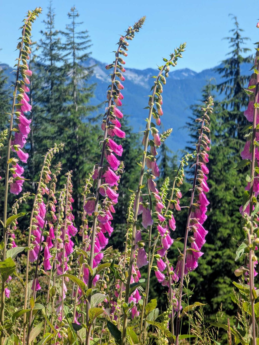 There are some wildflowers blooming sporadically throughout the hike, with foxglove in many places and more variety higher up. There were some bugs causing minimal annoyance along the whole trail and quite a few mosquitoes causing significant annoyance at the top.