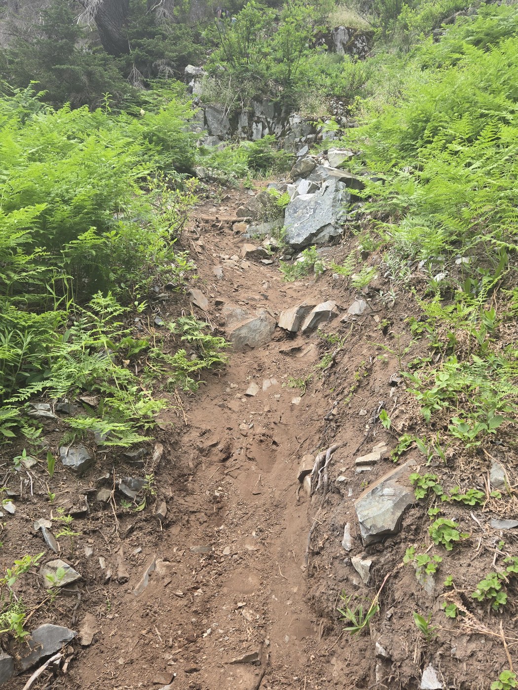 A note for potential future trailwork love - primarily observed it on the way down from the Snow Lake saddle on the switchbacks heading back to the trailhead. Forgot to mark on GPS - either after the first 2-3 switchbacks down the hill, or the last 2-3 switchbacks before trail straightens out. A shortcut or something was made on one of the switchbacks. It's more evident from the switchback above (a steep slide); only thought to take a photo afterward (which looks more mild) from below, looking up. Photo attached.