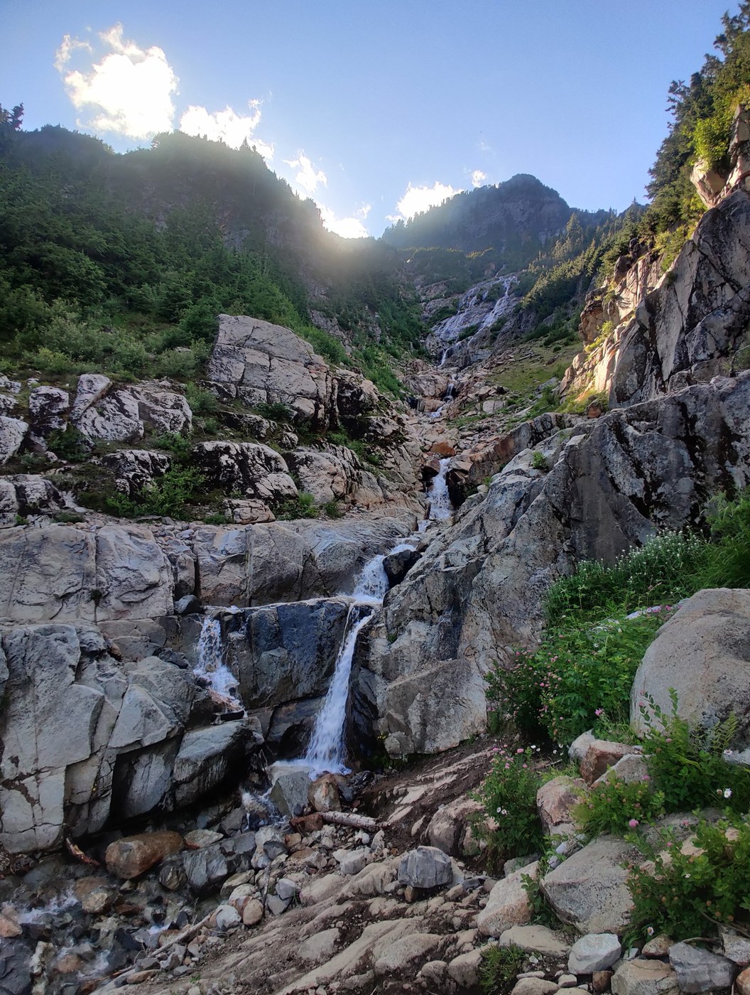 At approximately 3 miles, the forest begins opening up and you will shortly encounter a fairly significant waterfall. The first (and most significant) of several waterfall crossings you will encounter (season dependent). From here, gain roughly 1,000 feet of elevation in just under a mile to the third (significant) waterfall. Once you reach this spot, you are getting close - just 0.5 miles to the Basin.