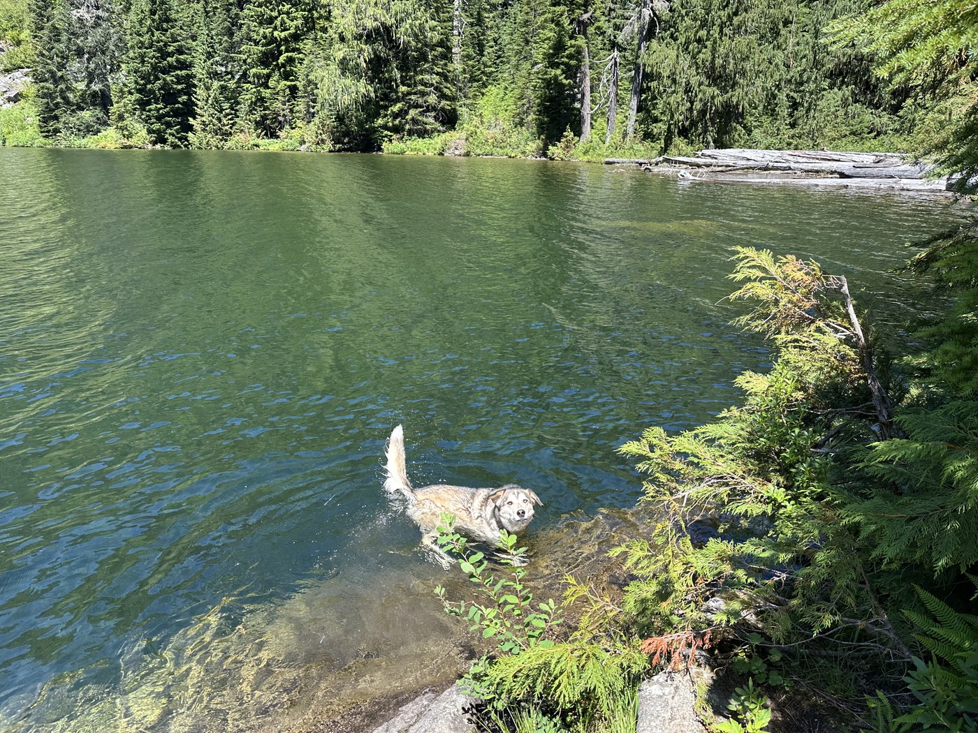 After having to turn around a couple months ago due to snow, was happy to make it to the lake this time! Tons of blueberries (a touch on the tart side but delicious) and salmon berries, and a few red huckleberries. Trail can be a little tricky in a couple spots; near the lake where there are two options for approach, the one on the right (north) has some deep sloshy mud to contend with (my dog underestimated the middle and sank in to her shoulders), while the left is much steeper. A relatively short section through the salmon berries is quite overgrown; I wouldn’t want to meet a bear there because there are no options for escape, but the dense growth means you’d probably hear one/see the bushes moving well in advance. The lower trail was crowded (no surprise at 11am on a Sunday), but once I turned off to Marten Lake I only saw one other couple and had the lake to myself while I was there, and thoroughly enjoyed a refreshing swim!