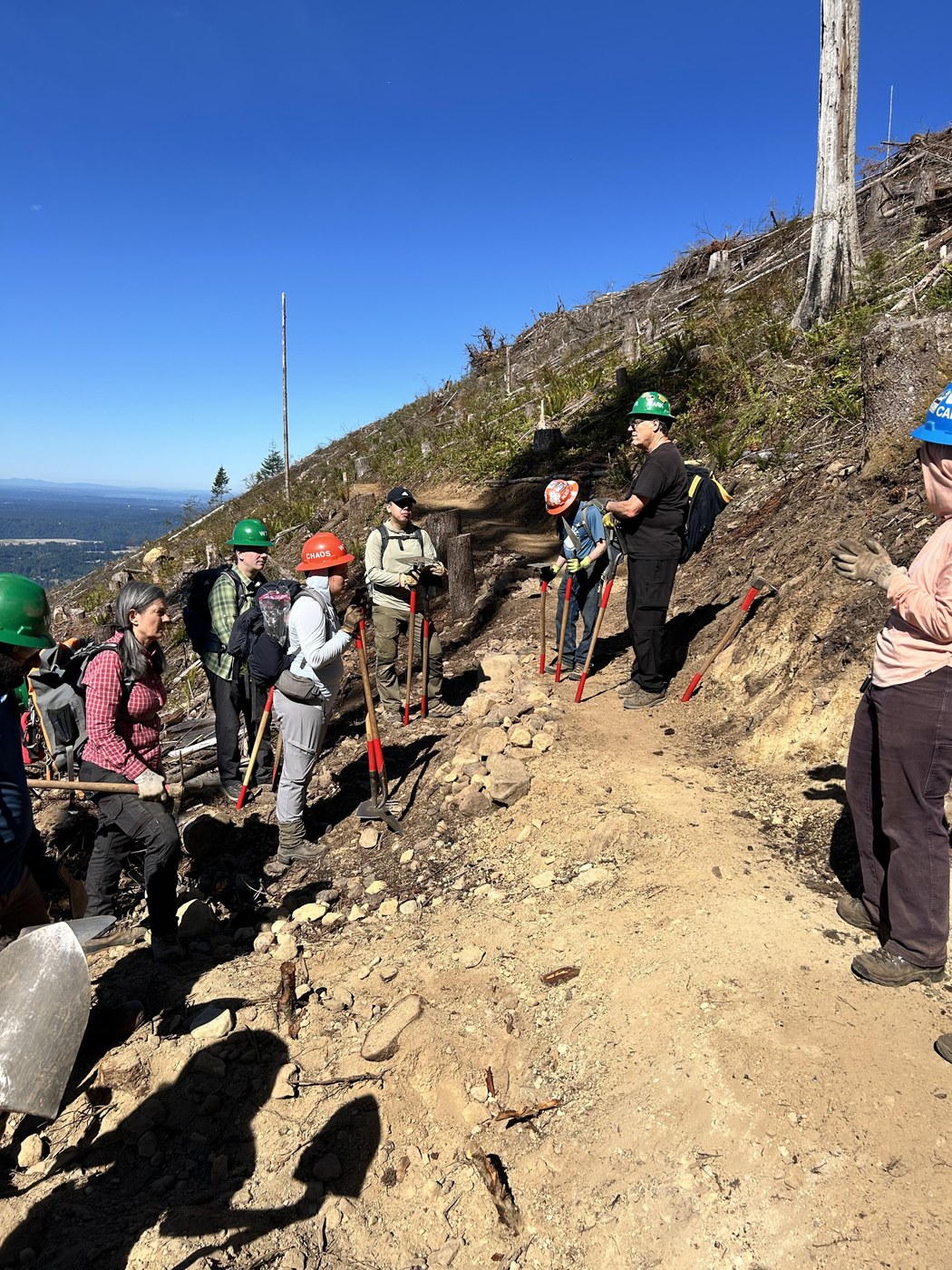 The WTA work party traveled by caravan about 3 miles up the gravel road, then hiked remainder up to the clear-cut area of Middle Tiger trail. We worked on removing rocks, smoothing tread, tackling stumps and roots, and creating a more defined slope on the exposed areas of the clear cut - over 200 feet of trail completed in a few hours with the whole team in action.