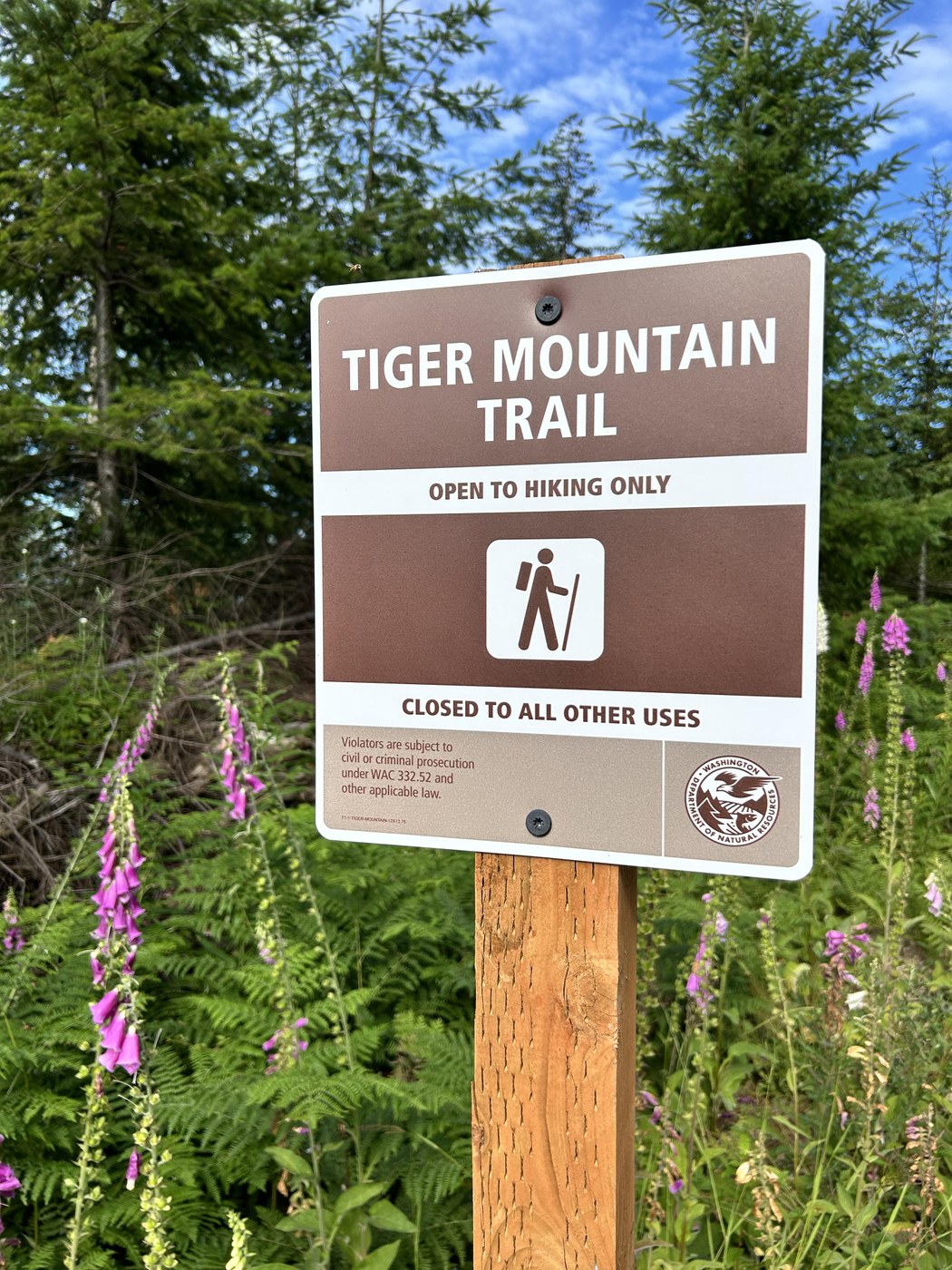 We only hiked through a small portion of the shaded tree canopy which was in good shape. There are additional work parties on this part of the Tiger Trail this summer, so join in! It will be a very nice trail, and much smoother and safer once the work is completed. And, bonus of unobstructed views of Tacoma/Rainier, too!