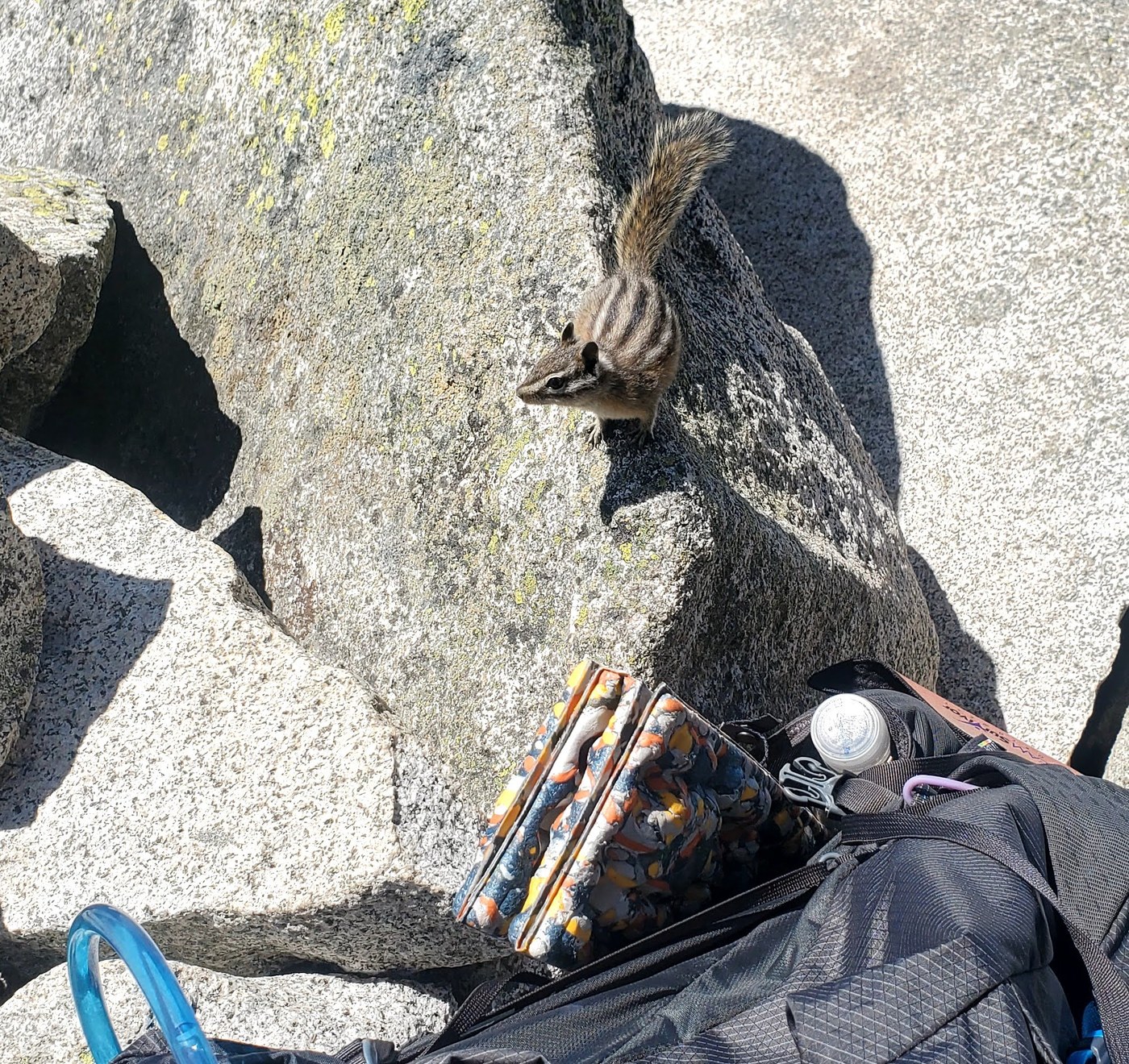 Wildlife: a few chipmunks at the fire lookout. Following Leave No Trace, we did not feed them. Also saw 2 deer and a wee, fuzzy mouse/vole.