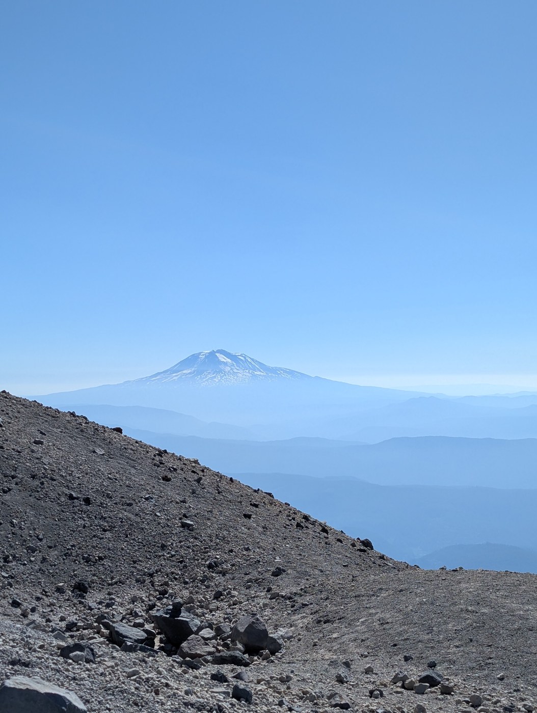 I reached the summit at 10 AM and soaked in the views. Before heading back down, I put gaiters on. I didn't feel like I needed them on the way up, but I was grateful to have them on the way down. The loose ash easily swallows whole shoes in places.