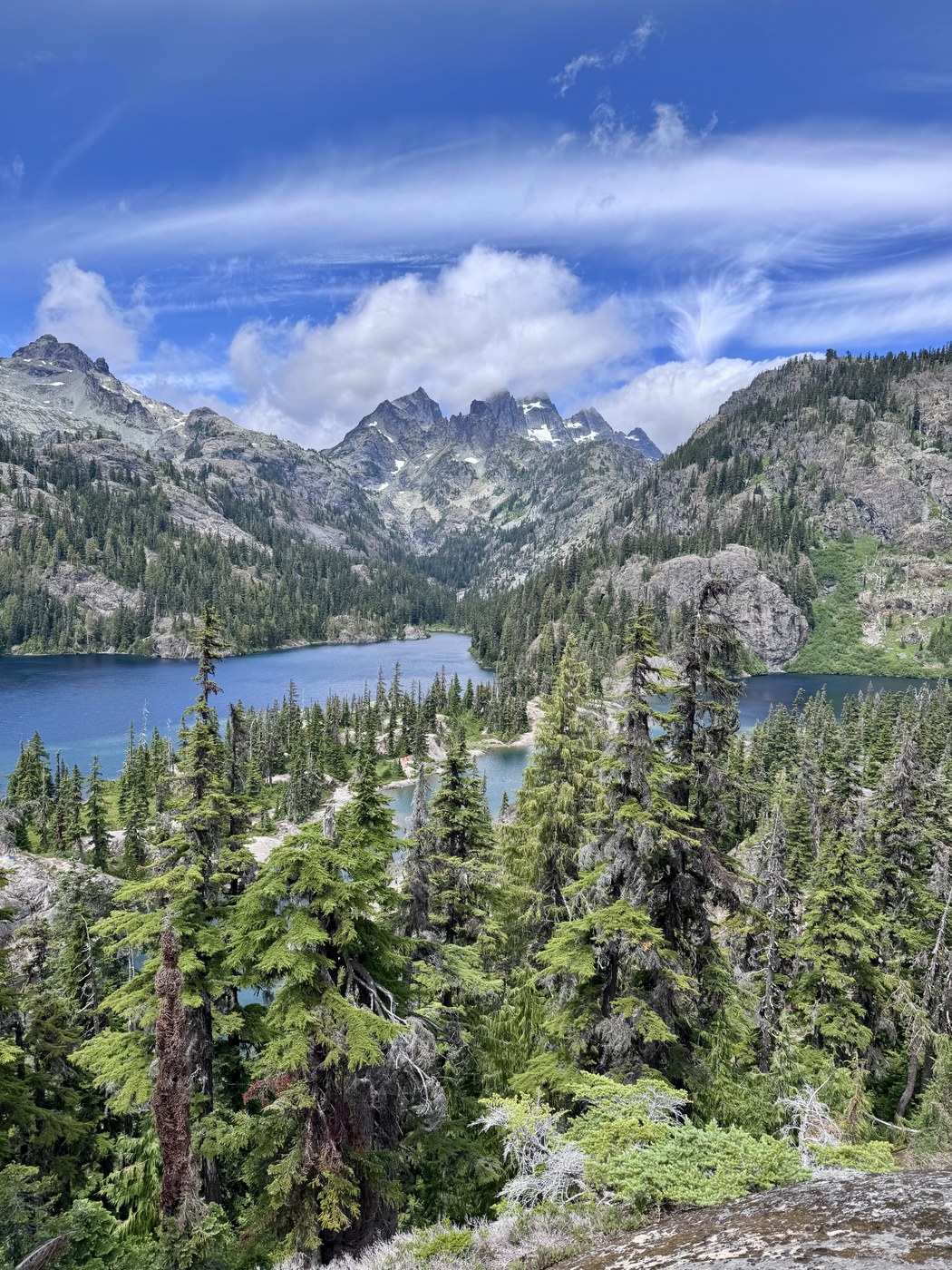 We were mostly spared the heat of the day hiking through the burn zone thanks to cloud cover. It was much warmer in that same exposed section when we passed through on the return hike. The switchbacks were fine with some overgrowth and a little mud as you get higher up. Tons of ripe huckleberries kept us energized. The lake view after the switchbacks is incredible and a worthy payoff for a hike which mostly didn’t feature much in the way of views.
