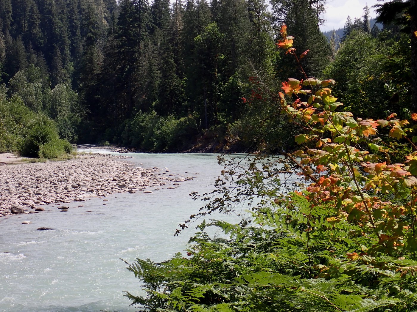 This is a good one for those who may not be in the kind of hiking shape they want to be (or those who are no longer in the kind of hiking shape they once were). This was a date hike with soaringeagle and we took it at a 'contemplative' pace. We saw a few Indian pipe, scrounged enough berries for pancakes and had lunch by the river. The trail is in good shape, one blowdown to step over and a bit overgrown in a few spots, but good tread. The hucks are about gone, blue ones are mushy and red ones getting that way. There are some thimbleberries and some nice little trailing blackberries. There is some fall color already on the vine maple, probably heat stress, the forest is very dry. Loo in good shape with TP today.
