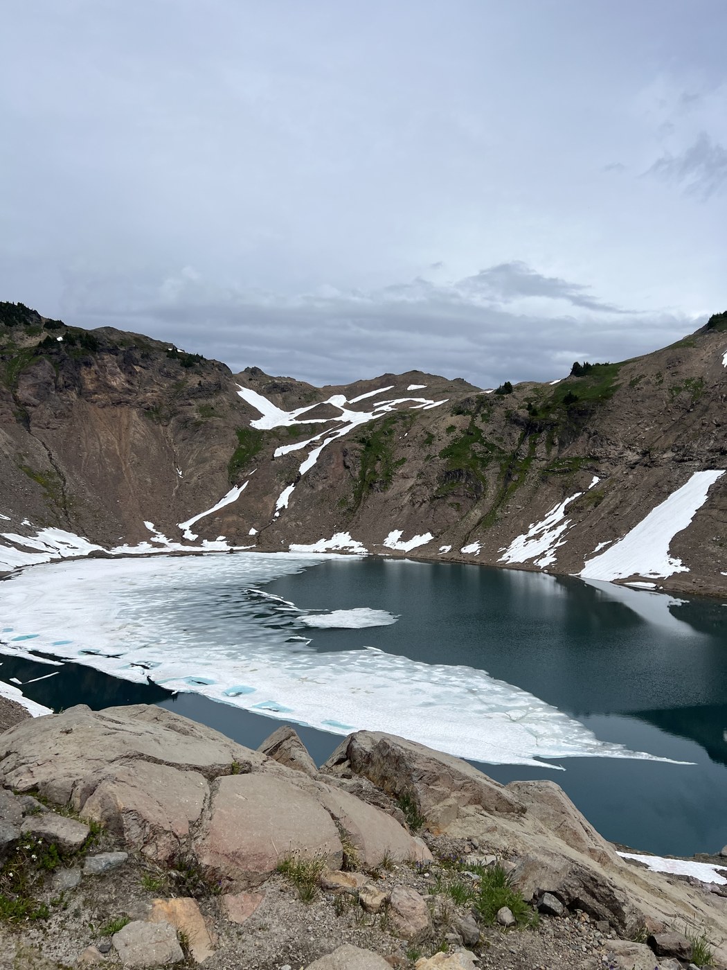 Pulled into the Berry Patch trailhead at 9AM Sunday and there was a line of cars down the road to Snowgrass TH, mostly folks who were already out overnight. Someone left early so I was still able to grab the last parking spot in the lot, then took the connector trail to the Snowgrass TH to hike the loop counter clockwise. Most were hiking clockwise which I know is the preferred route and I can see why; going down Goat Ridge was tough on the knees and slow. If I did it again, I would still start from Snowgrass though. I liked starting out easy and getting up to the good stuff above treeline sooner. Mosquitos are tolerable only if you keep moving, don't stop if you can help it. The wildflowers are indescribable, I just kept saying "insane" over and over again. I did not mark ripe berries because the blueberries were not ripe but they are starting to come in very green, some even have some color to them but wouldn't expect them to be ready until maybe start of August. I also marked 'snow free' conditions which is 99.99% true, there are still some patches immediately around the lake that are each less than a dozen steps to cross. I know snow sticks around for a long time up there so it might not melt as fast as other areas. The lake is mostly thawed with some ice holding on around the edge of the far side. Heard lots of marmots whistling but only saw two, saw one goat wayyyy in the distance of the upper mountains, and a few pikas in various talus fields. Back to the car at 3pm. Definitely park at the trailhead you end at because while the connector trail is short and flat, it's nice to not deal with after 12 miles.