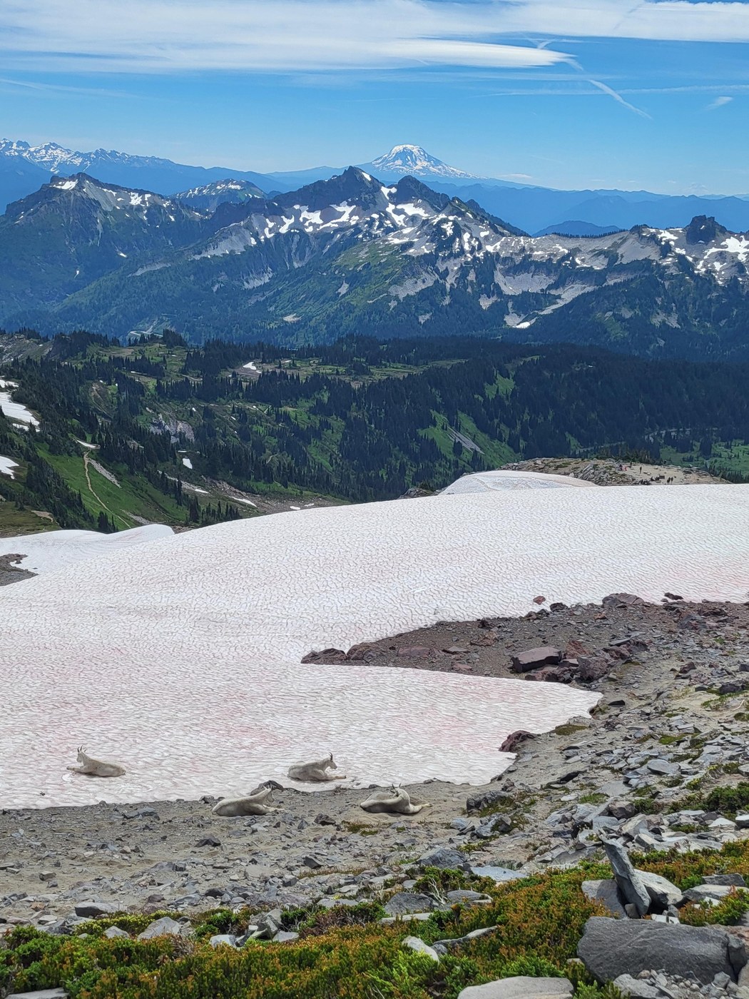There were 5 mountain goats just below the trail near the top that sat there for hours, just chilling.