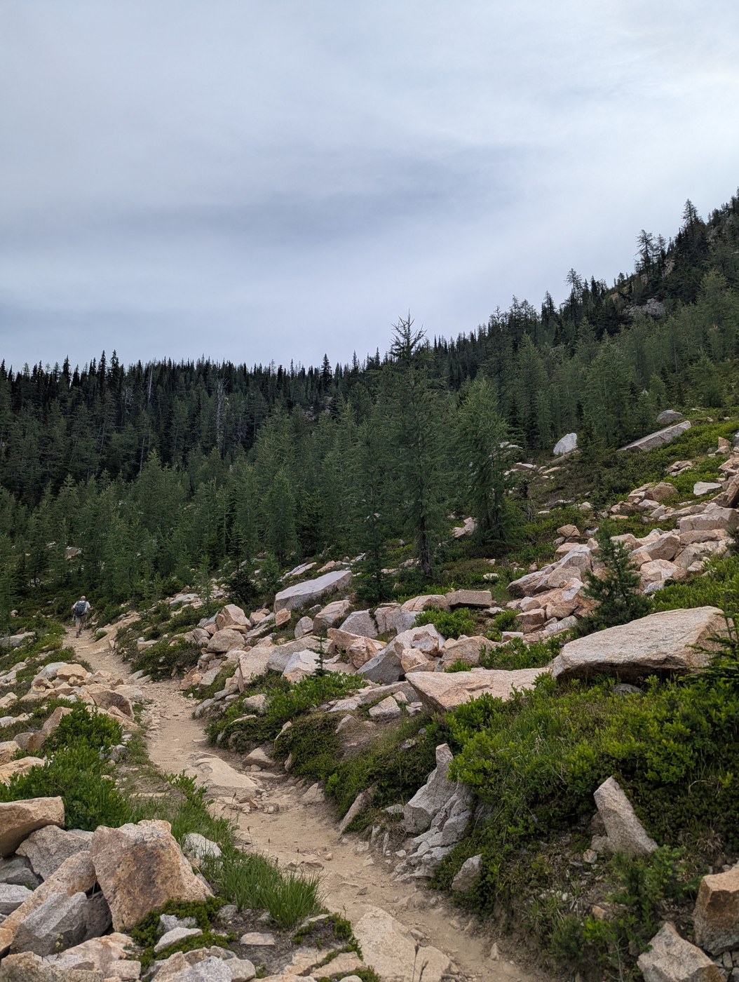 The trail itself is well maintained and gently graded. It winds through the forest. It looks like there's a western spruce budworm infestation affecting many of the trees. There are multiple small creek crossings and a few small waterfalls to filter water if needed. Once out of the forest, the wildflowers are in full bloom, and there are sweeping views of the surrounding peaks. We even saw the uncommon white paintbrush. There's no snow or major obstacles. Up at the pass there are multiple spots for lunch as well as small campsites higher up. This would be a lovely spot to return to in the fall!