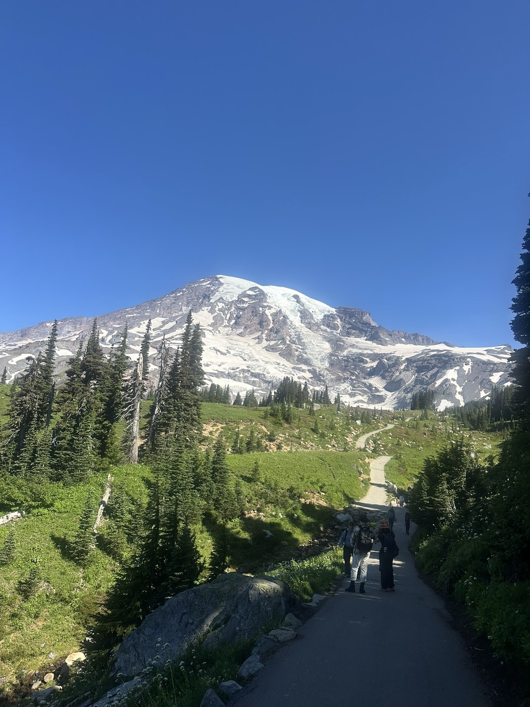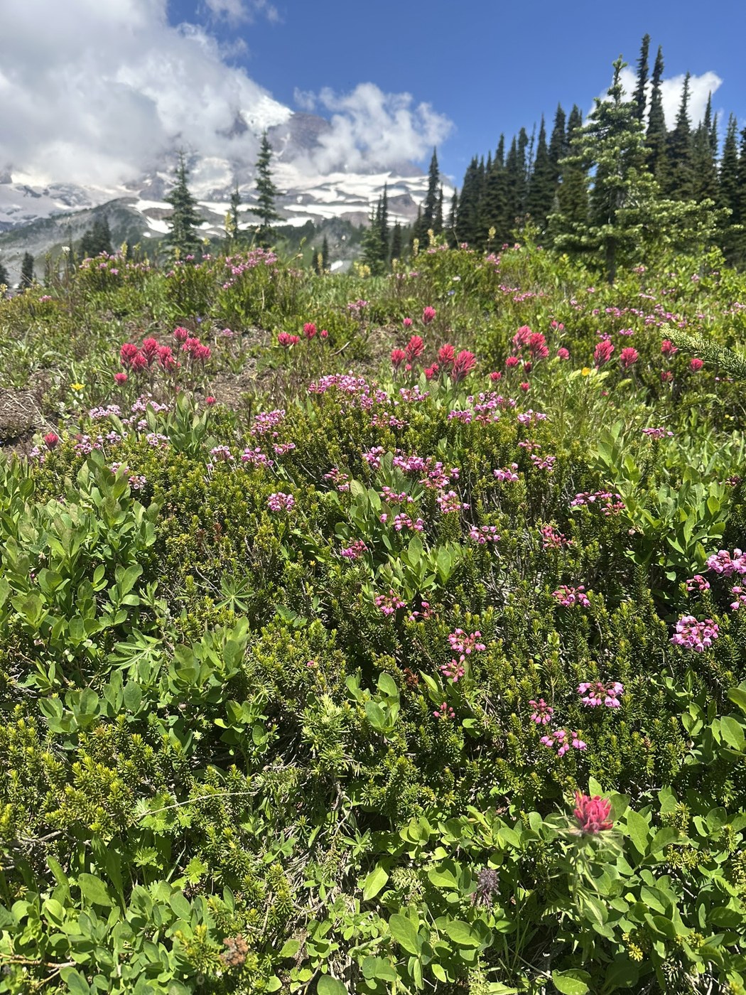 Arrived at Paradise parking lot around 9:30am on a Wednesday, lot was full but still some parking down the road, probably about 10 minutes walk from the trailhead (they were doing paving work in the parking lot which added an extra obstacle). Started clockwise, initial half mile is steep but the grade lessens after that. Beautiful clear views of Mt Rainier today - snowfields were surrounding the trail but not much snow on the trail until after crossing the high summit and heading back down towards Paradise. Crowds were manageable but noticeably busier on the second half of the trail starting around noon. Huge variety of wildflowers blooming in the meadows on the east part of the trail after high summit. Watch recorded 6 miles, 1,970 feet, just under 3 hours with minor jaunts to Glacier Vista and Myrtle Falls.