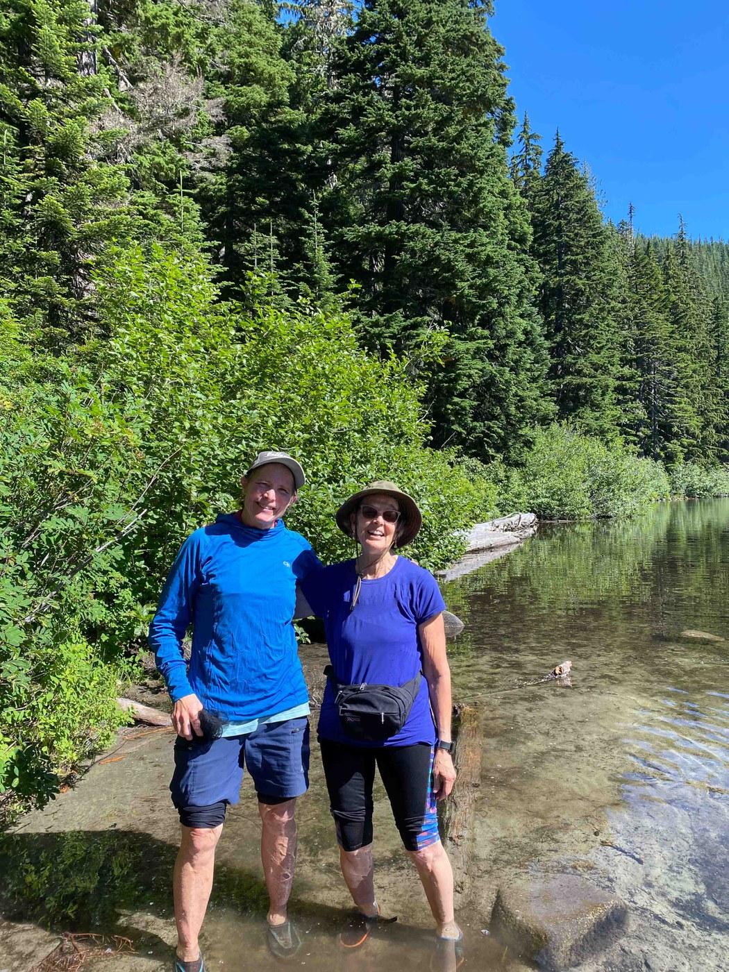 9 of us from the Mountaineers enjoyed a "sunrise start" from Exit 47 (Pratt Lake TH) walking by 6:30 a.m. for a fabulous visit first to Talapus Lake, where we took a 20-minute chat and snack break, then Olallie Lake on our way back, where we enjoyed 40 minutes and some wading time. 3-4 of us cooled off our feet (I totally swear by it for recovery!) Balmy.