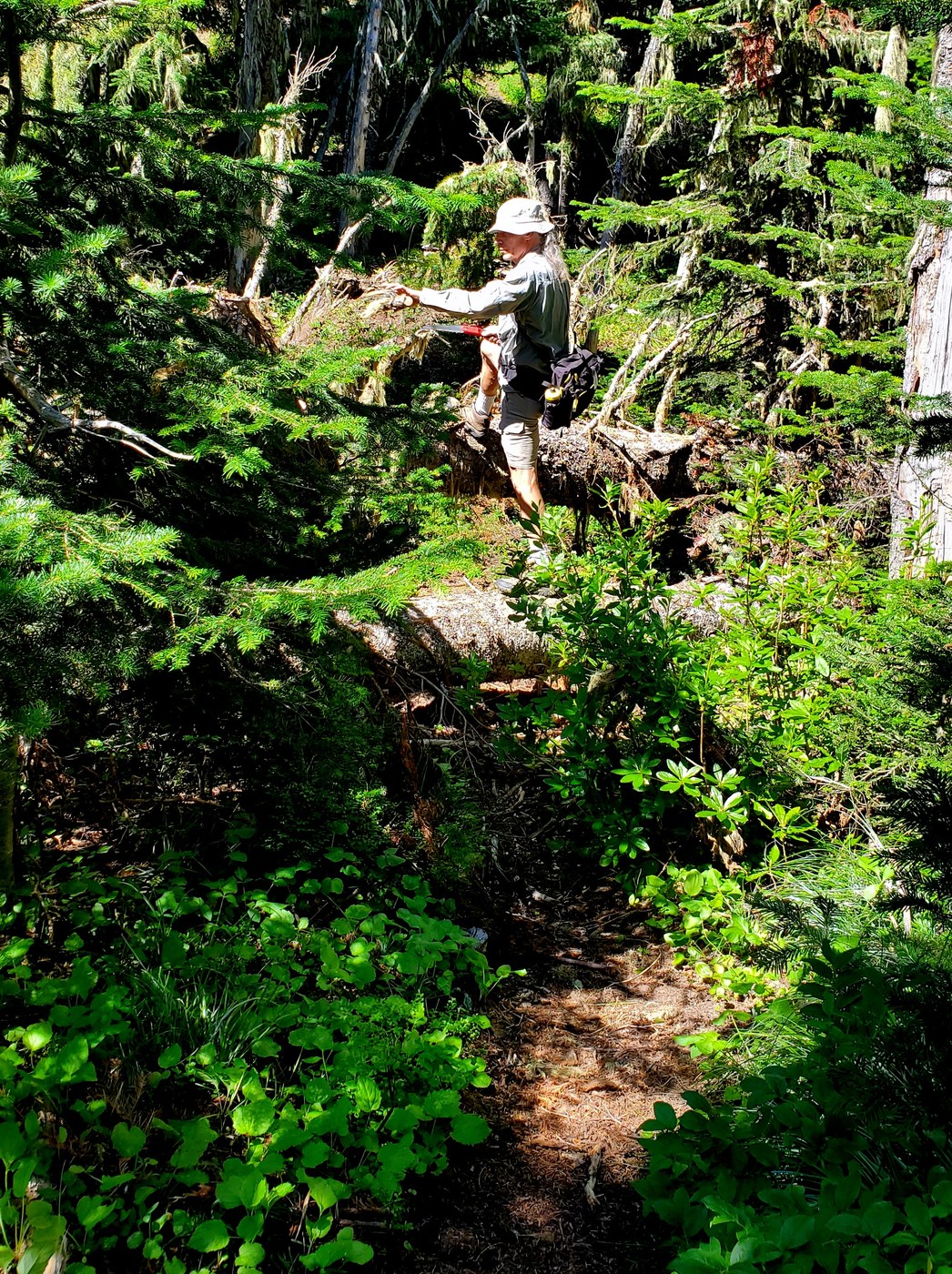 The trail is 2 miles to Glacier View. It's overgrown in places, debris covered in places, and great in places. But has about 30 or 40 fallen trees across it. We had a hand saw and had some incentive to cut smaller branches to get through once we realized we'd be coming down the same trail. And sure enough, on the way down we'd come up on some 3 tree monster pile and by finding our recent cuts we were able to find our trail through.