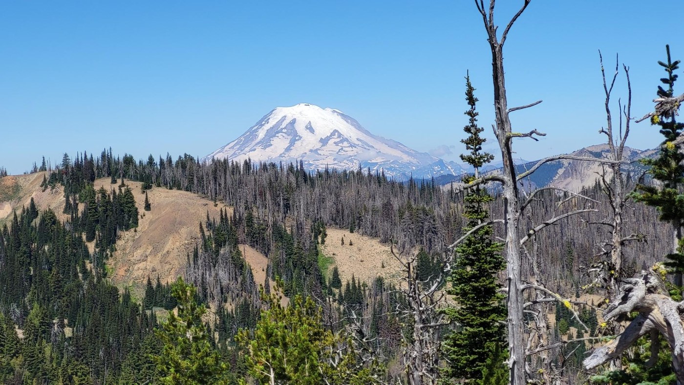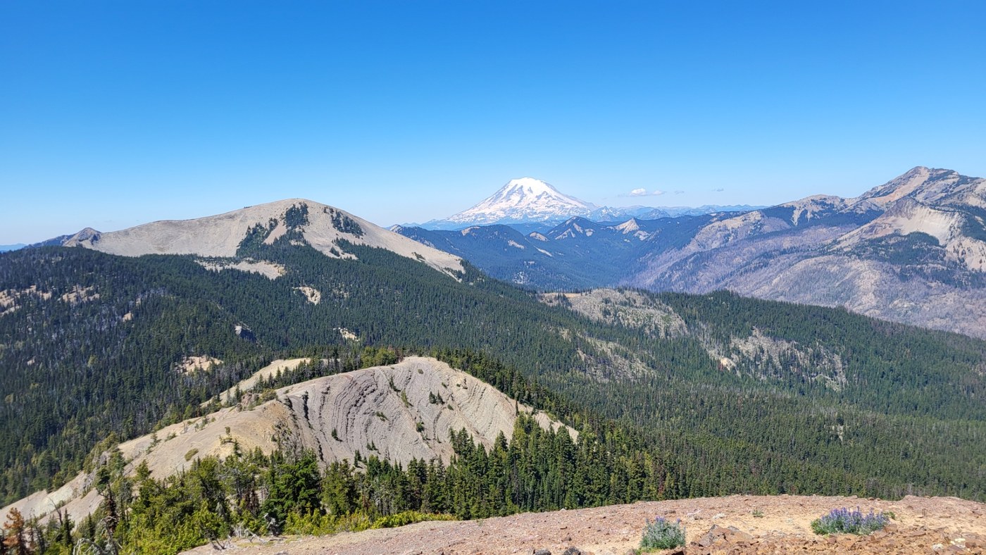 There was a lot of down at the beginning of the hike, some of it on loose rocks. There had been a fire in 2021. We went through a burned area and then entered some open area, before going into the woods again. The summit was open and mostly bare. There were lovely views of Mt. Rainier from the summit of Burnt Mt., as well as from the road at the beginning of the trail.