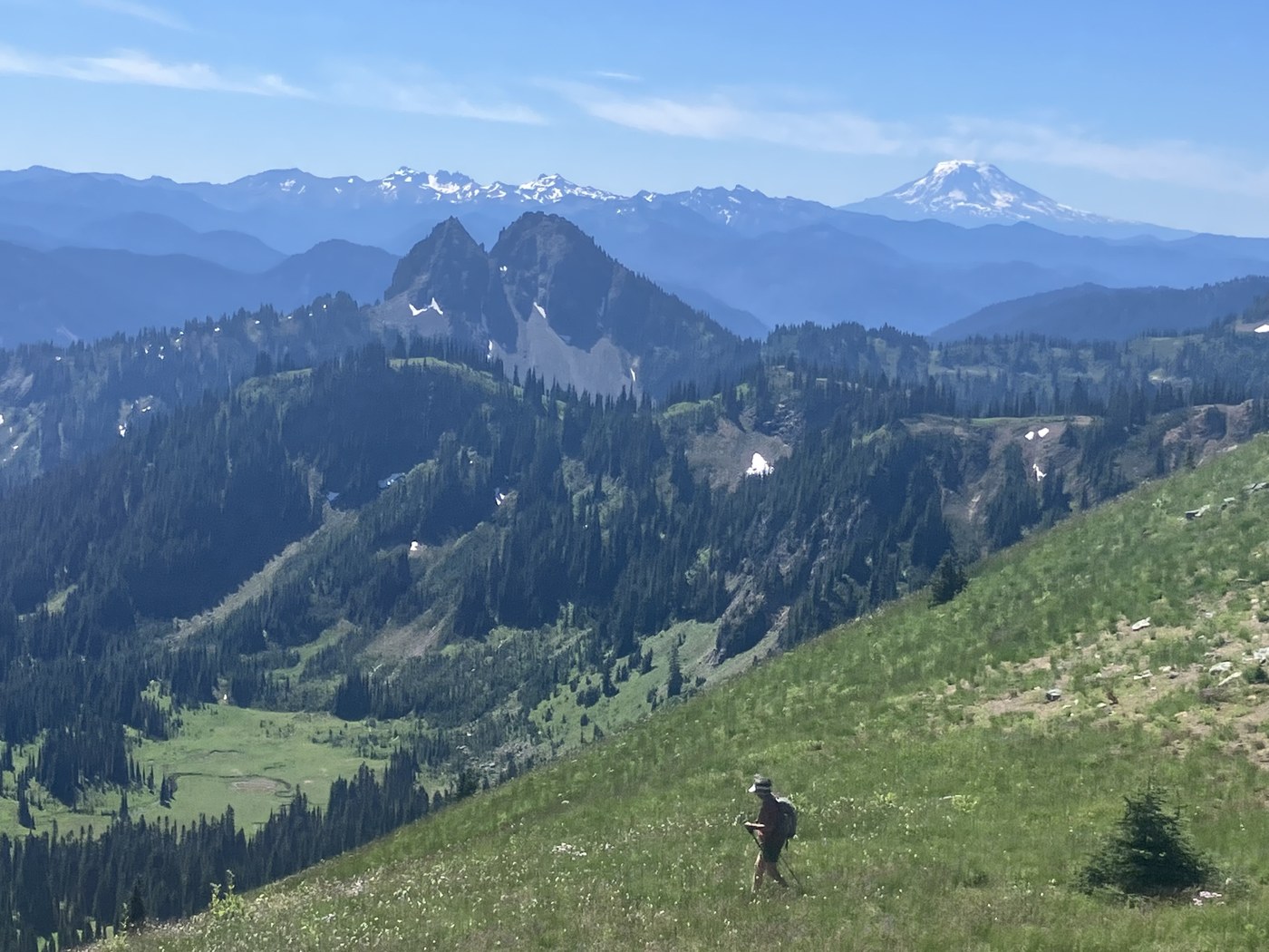 The trail up to the lakes through the old growth is lovely, mostly shaded, moderate grade. (Sign says 3.5 miles to lakes from TH.) A short while after the lakes you take a hard right up through gorgeous but STEEP meadows - full Julie Andrews vibe -- to reach ridge. Saddle is a great stopping point but we went on to (false?) summit, probably 1- 1.5 miles and maybe 1300 feet above Owyhigh. Gorgeous gorgeous views all around and wildflowers: lupine, scarlet paintbrush, pasqueflower seedheads, phlox, and lots more. Good hard climb and some loose rock near the top but views grand everywhere. Bugs a bit of an issue especially in the meadowy spots.