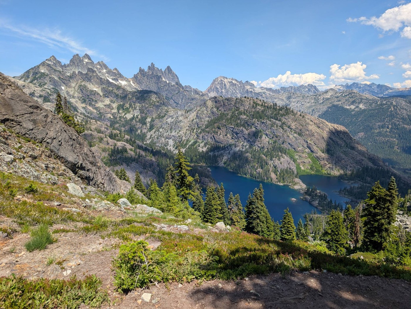 Morning at Deep Lake was beautiful and we had some adorable tiny diving ducks for breakfast entertainment. The trail from Deep Lake to Waptus River goes along a canyon for a bit before turning into a mostly shaded walk with mountains saying hi every now and then. There are great bridges at both water crossings and the second has easy water access as well as a nice view. Fill up here because this is the last good source for some time. The long climb up to Escondido Ridge was pretty well shaded over halfway and it was hot so we were very grateful. Toward the top the views open up and are spectacular. The mountains on the sweeping mountains, like Bears Breast on the Waptus side reminded me of the Sierras. We found a couple magical trickles and pools along the way, that were lovely for dunking a hat or buff to cool off.