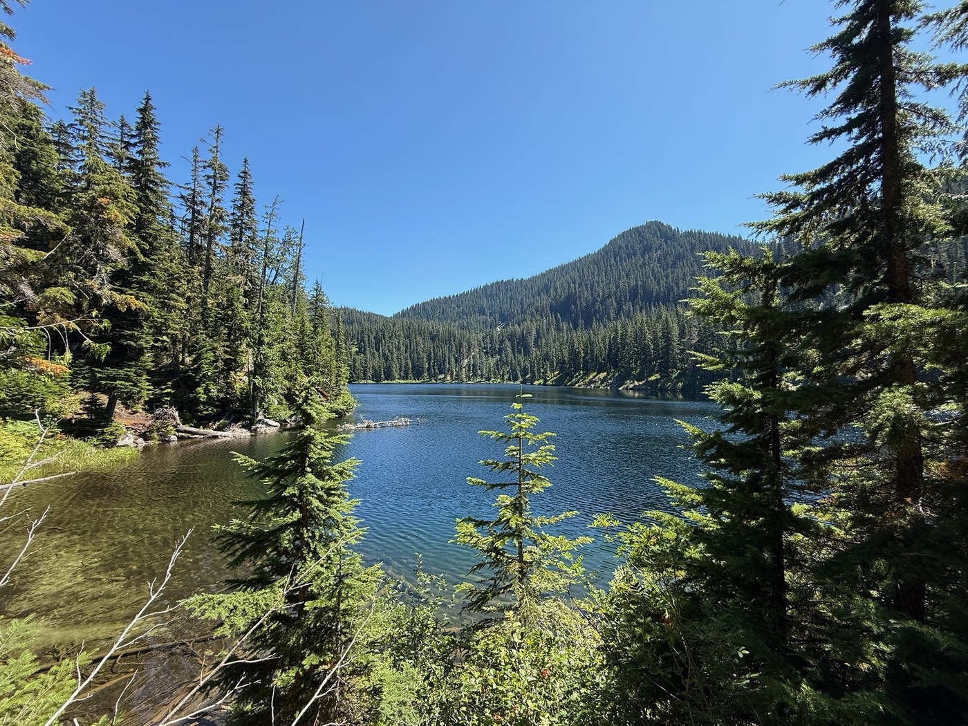 The trail, starting at the Pratt Lake / Granite Mountain trailhead, was in fine shape, but I would not start there again. Going in via Talapus Lake saves you 1,000 feet in elevation gain, and by the time you get to the ridge above the Pratt basin, you'll appreciate that. On the map, it looks like you just drop into the basin and you're there. In reality, you lose nearly 800 feet in about a mile, and then it's nearly another mile to the campsites and lake access. That 1.8 miles felt very long.
