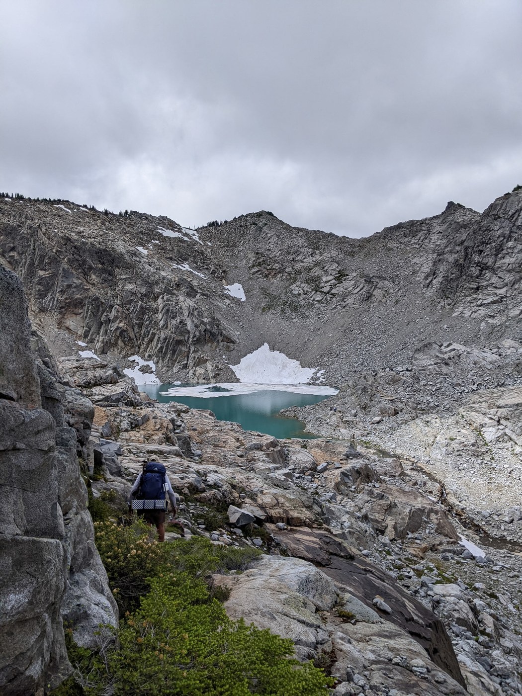 Day 2 - Tank Lakes to Big Heart Lake - We awoke to some moving clouds that obscured the views for a while, but we could tell that the weather was going to clear up. After a quick breakfast, we set off for what we knew would be the most challenging section of the trip. The terrain was fairly straightforward coming out of Tank Lakes, but increased in intensity as we continued toward Iron Cap Gap. GPS / route-finding skills were necessary in this section. There are cairns, but sometimes it is hard to pick them out in the midst of the boulder fields. We only got off course one time and did some bushwacking to get back to the trail. As someone who doesn't love navigating boulder fields, this section was a bit of a battle. However, the scenery and expanse of wild spaces surrounding us made it worth the discomfort. The actual crux of this section, for us, came on the spine between Angeline and Chetwoot Lakes. A couple of the trails in this section are quite exposed and a misstep or fall here could be catastrophic. We had read trip reports saying that previous hikers had underestimated the complexity of the spine and we were in the same boat. This section took us longer to navigate than we had anticipated - slightly over an hour to cover 1 mile! Once we got through that part, it was smooth sailing down to Big Heart Lake. Overall, we spent 12 hours covering the terrain on Day 2.